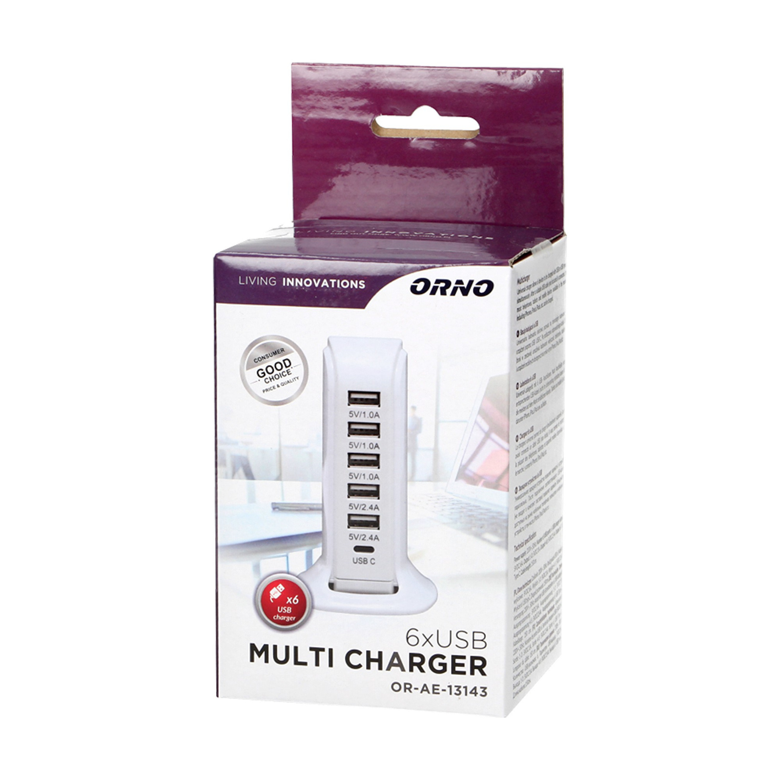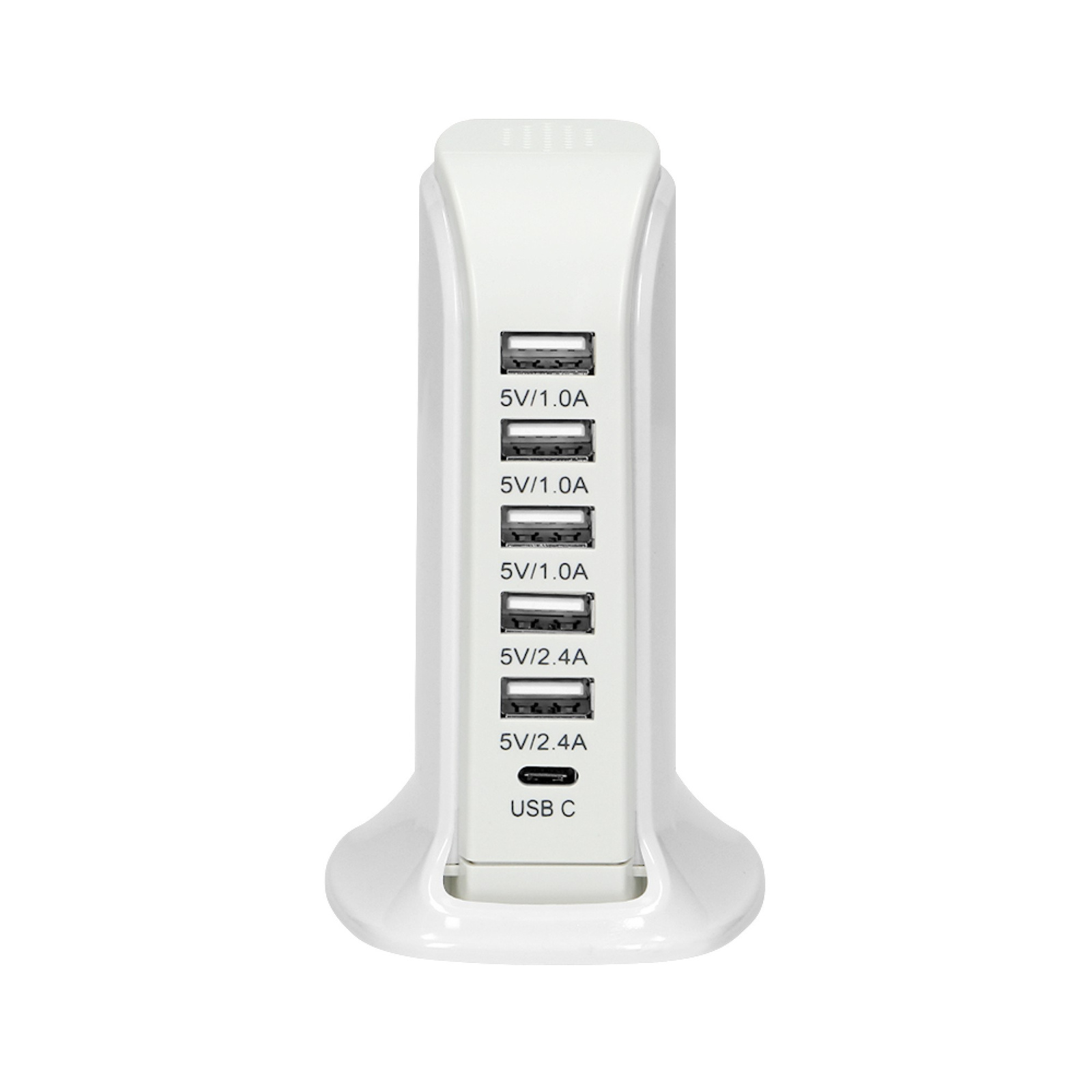 Uniwersalna ładowarka sieciowa pozwala na równoległe ładowanie 6 urządzeń poprzez USB i USB C. Po podłączeniu odpowiedniego kabla USB (brak w zestawie) umożliwia ładowanie większości telefonów, tabletów i urządzeń mobilnych dostępnych na rynku w tym iPhone, iPod, iPad itd.