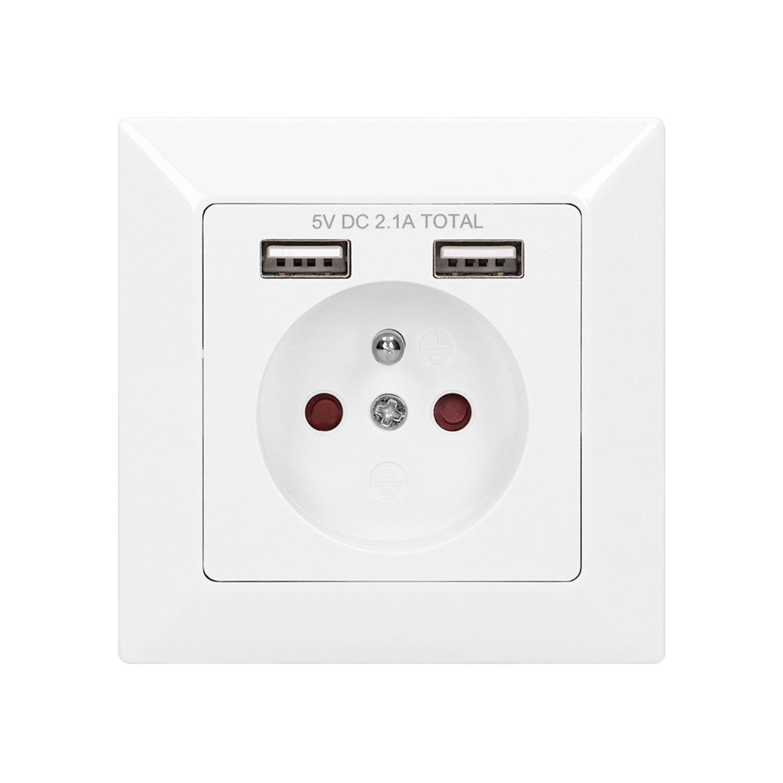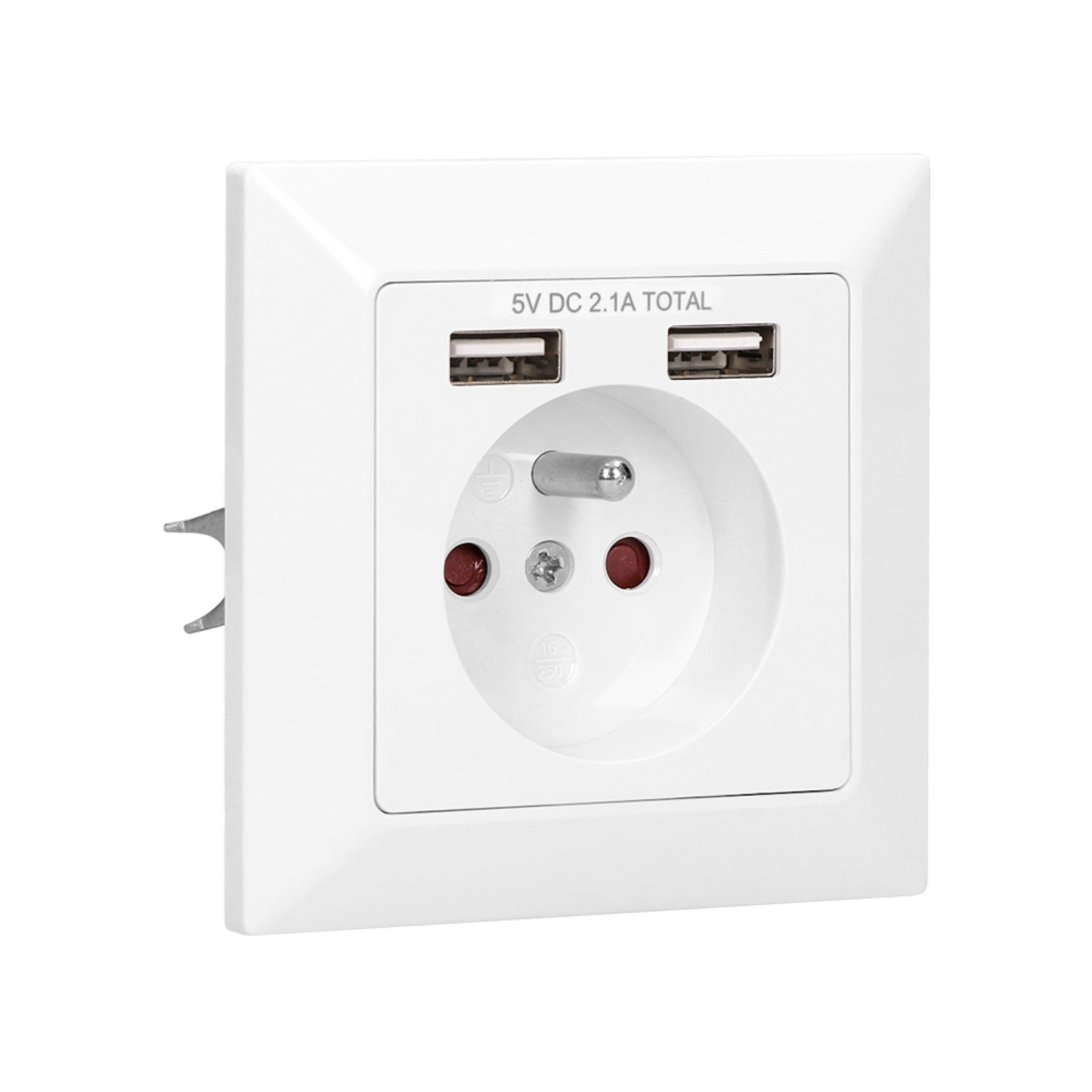 Gniazdo elektryczne 2P+Z z dodatkowymi portami ładowarki USB. Po podłączeniu odpowiedniego kabla USB (brak w zestawie) umożliwia ładowanie większości telefonów, tabletów i urządzeń mobilnych dostępnych na rynku, w tym iPhone, iPad, iPod itp. Montaż w standardowej puszcze fi 60 mm.