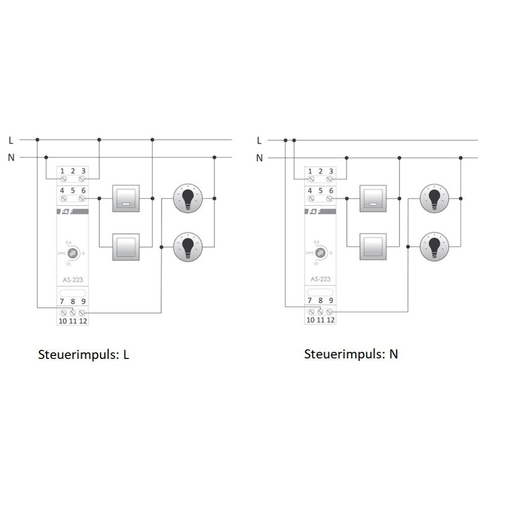 Działanie:Załączony wyłącznikiem chwilowym (dzwonkowym) automat schodowy podtrzymuje oświetlenie przez czas ustawiony pokrętłem. Po upływie nastawionego czasu automat wyłączy oświetlenie samoczynnie. Po wyłączeniu oświetlenia możemy je załączyć ponownie. Funkcja przeciwblokady nie pozwala na ciągłe świecenie oświetlenia po zablokowaniu wyłącznika schodowego, tzn. po zablokowaniu wyłącznika (np. zapałką) automat odmierzy zadany czas i wyłączy oświetlenie. Ponowne załączenie oświetlenia może nastąpić po usunięciu blokady.