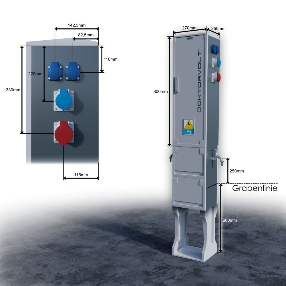 - Kempingowy dystrybutor zasilania CV-CAMP 2x16A 5P 400V 4x16A 2p+E 230V 2x16A 3P 230V Kolumna dystrybucyjna z przyłączem wody DV-2209-D Doktorvolt skrzynka rozdzielcza kempingowa