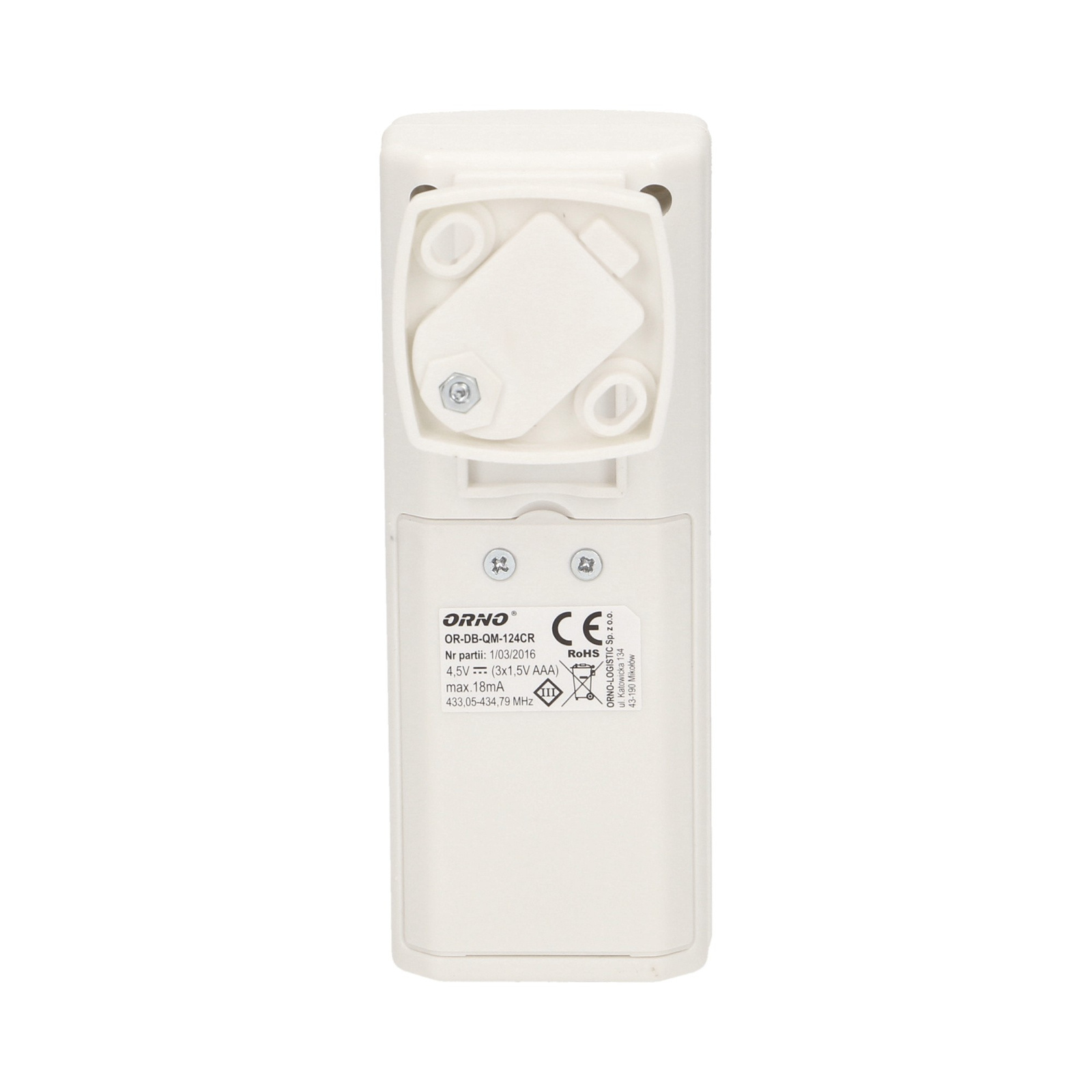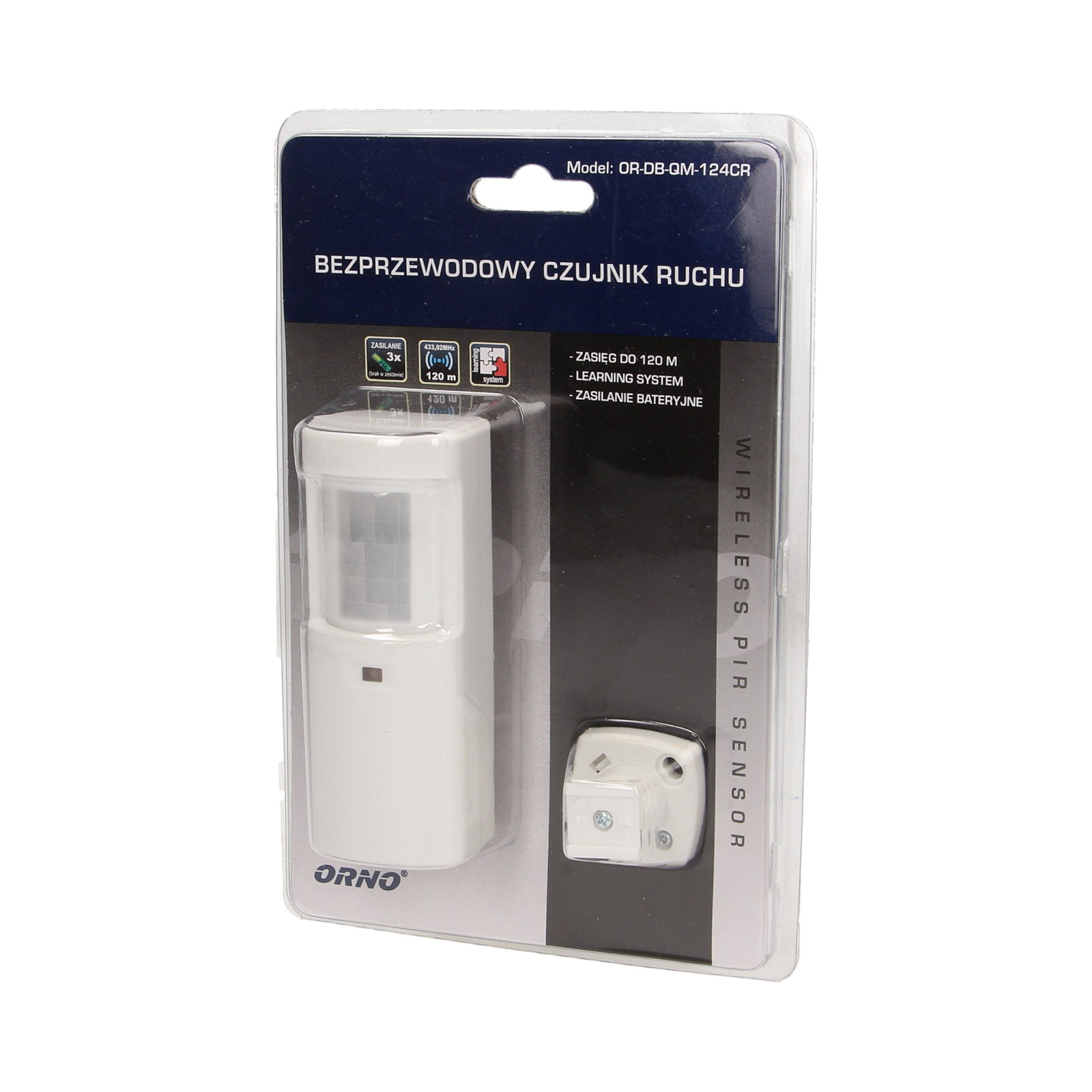 Bezprzewodowy czujnik ruchu PIR umożliwia kontrolę drzwi wejściowych, korytarzy, pomieszczeń magazynowych, piwnic, wjazdów, parkingów itp., zasięg w terenie otwartym do 120 m, transmisja radiowa, (częstotliwość pracy 433MHz), współpracuje z odbiornikami dzwonków z serii LOGICO: OR-DB-QM-124, OR-DB-QM-125 pełniącymi funkcję centrali alarmowej, learning system (automatyczne logowanie), zasięg wykrywania ruchu: 5–8 m, kąt widzenia czujnika: 45°, stopień ochrony: IP20