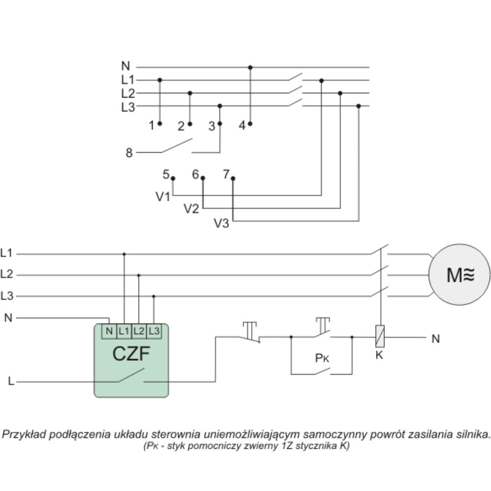 Czujnik zaniku fazy z kontrolą styków stycznika przeznaczony jest do zabezpieczenia silników elektrycznych zasilanych z sieci trójfazowej w przypadkach zaniku napięcia w co najmniej jednej fazie lub asymetrii napięć między fazami oraz uszkodzenia styków stycznika załączającego grożącymi zniszczeniem silnika.