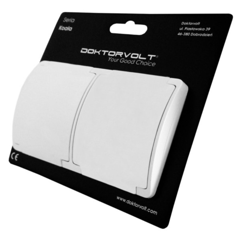 - Gniazdo podwójne z uziemieniem 2x2P+Z natynkowe IP44 białe z klapką białą
