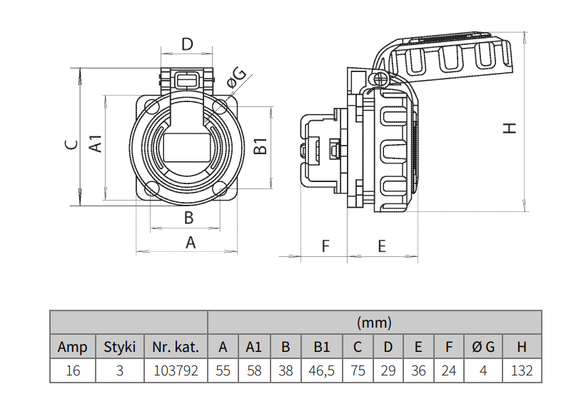 - Rodzaj gniazda: tablicowe proste hermetyczne