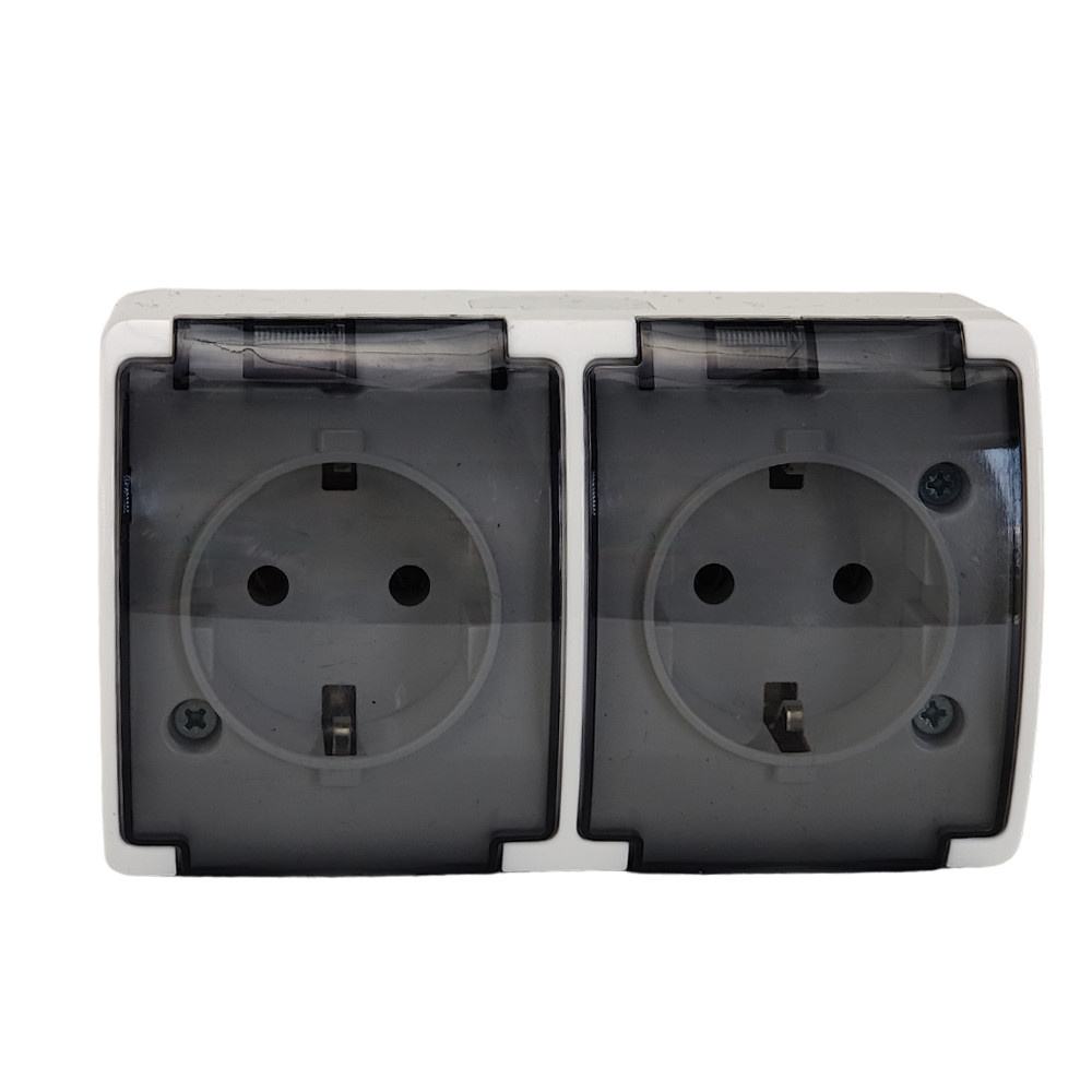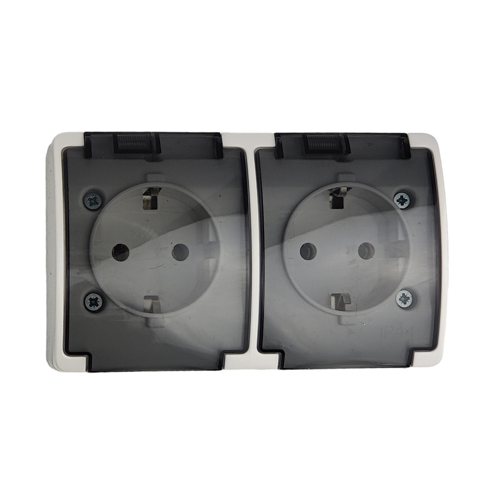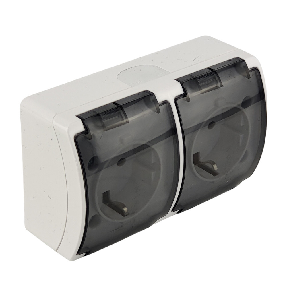 - Gniazdo podwójne SCHUKO natynkowe ViPlast Koala IP44 białe z dymną klapką 182‑51 Hermetyczne gniazdo o wymiarach 75 × 123 × 48 mm