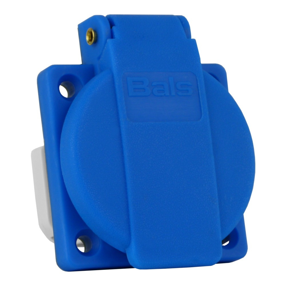 Gniazdo 230V marki Bals z systemem Quick-Connect w kolorze niebieskim. Jednofazowe gniazdo z bolcem uziemiającym i stopniem ochrony IP54.