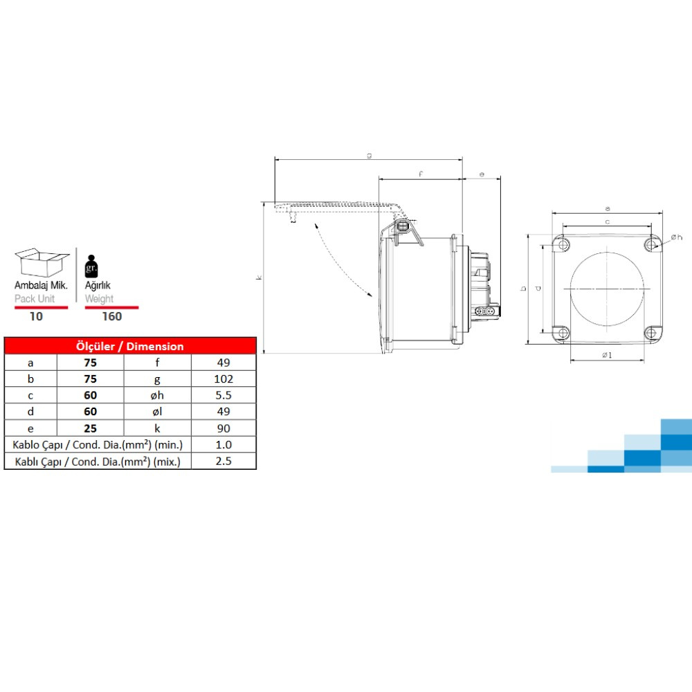 Gniazdo tablicowe proste CEE 400V 16A/4P 75x75 mm 3122-322-1675