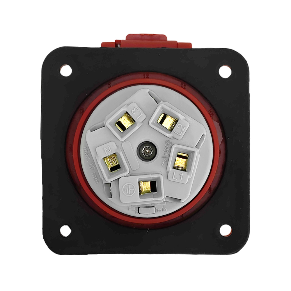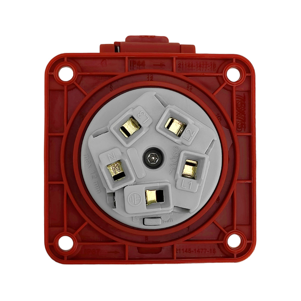 Wysokiej jakości gniazdo tablicowe proste 400V o stopniu ochrony IP44. Solidna konstrukcja zapewnia wysoką odporność na uderzenia.