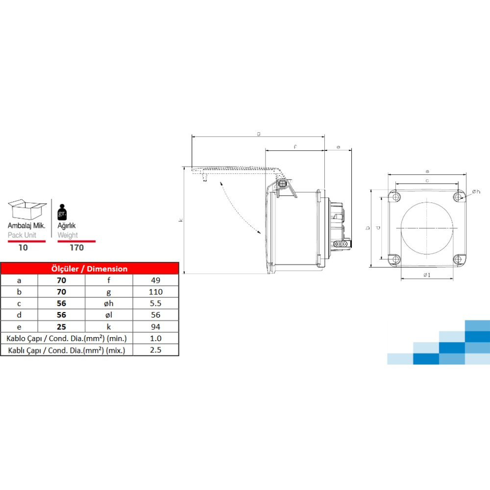 Gniazdo tablicowe proste CEE 400V 16A/5P 70x70 mm 3105-321-1670