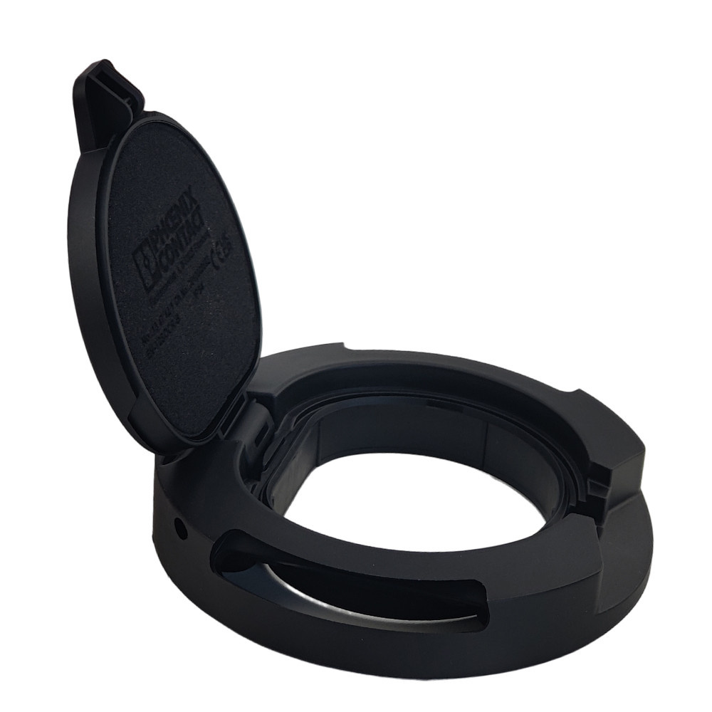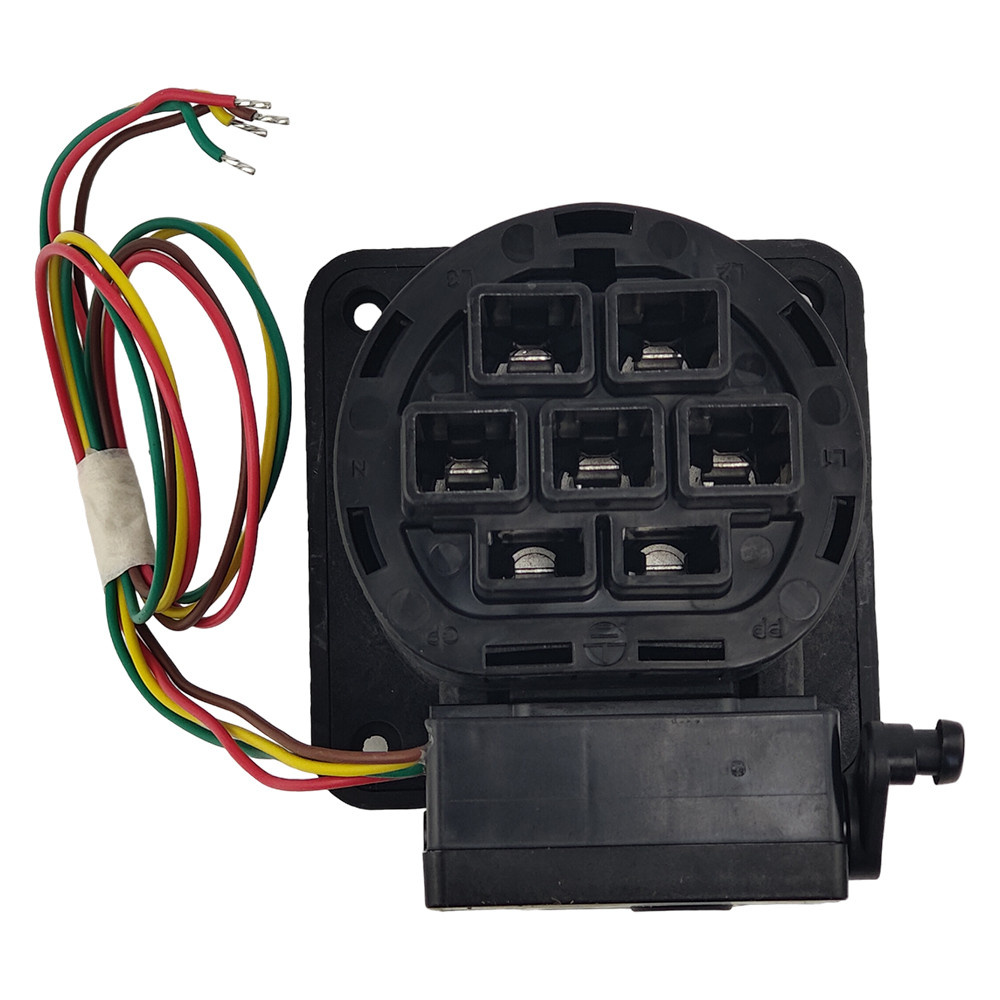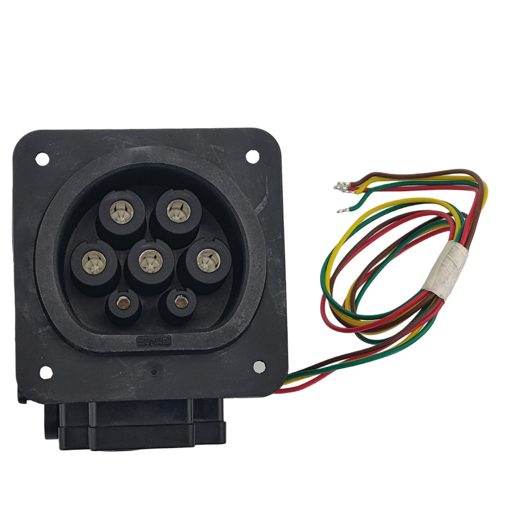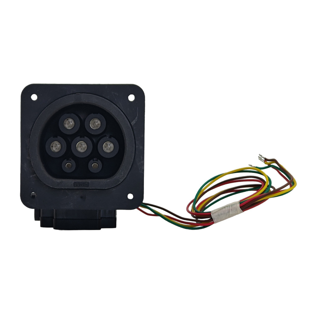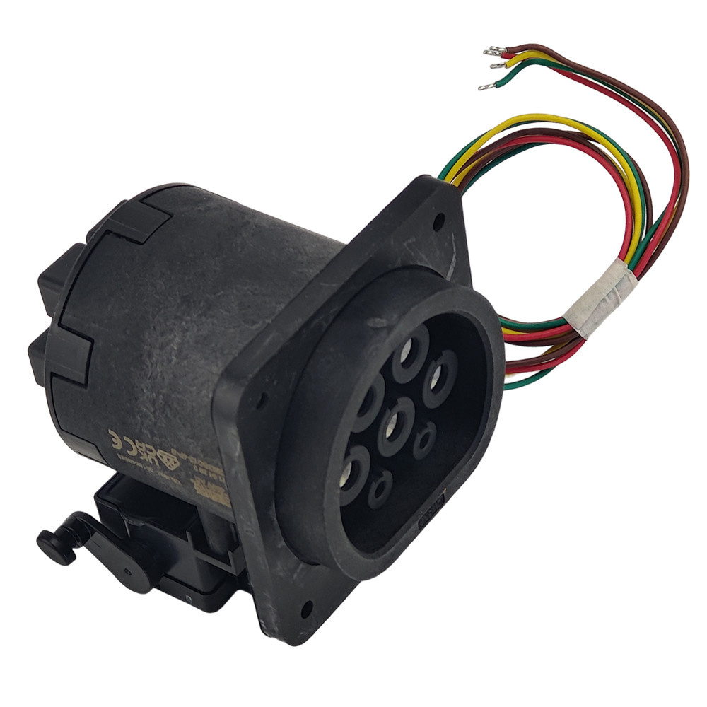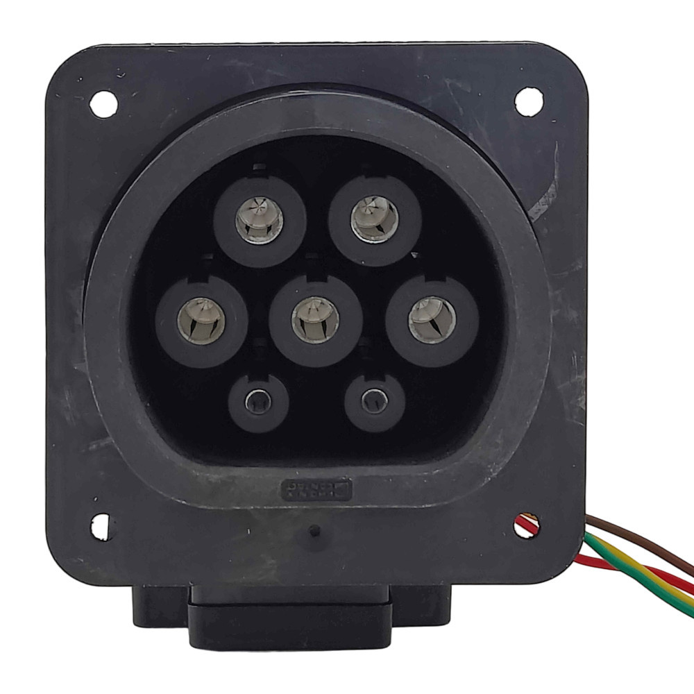 Gniazdo stacji ładowania z klapką, do ładowania pojazdów elektrycznych prądem przemiennym (AC), kompatybilny z wtykami stacji ładowania typu 2. Do montażu w stacjach ładowania pojazdów elektrycznych.