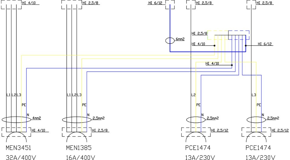 | gniazda siłowe | 32A 5P 400V IP44 czerwone Typ 3451 Mennekes 16A 5P 400V IP44 czerwone Typ 1385 Mennekes |