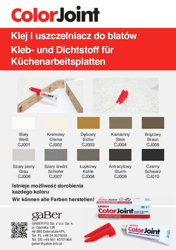 ➡️ ColorJoint jest dopasowanym kolorystycznie klejem i uszczelniaczem do łączenia blatów oraz montażu listew przyblatowych i paneli kuchennych. Używany jest też do uszczelniania zlewozmywaków, uszczelniania wycięć pod zlewozmywaki i innych miejsc narażonych na działanie wody.