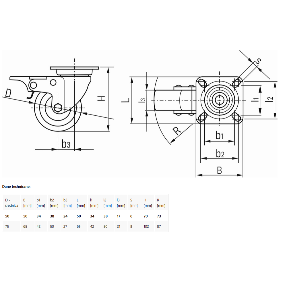Koło obrotowe z hamulcem o średnicy 50 mm lub 75 mm
