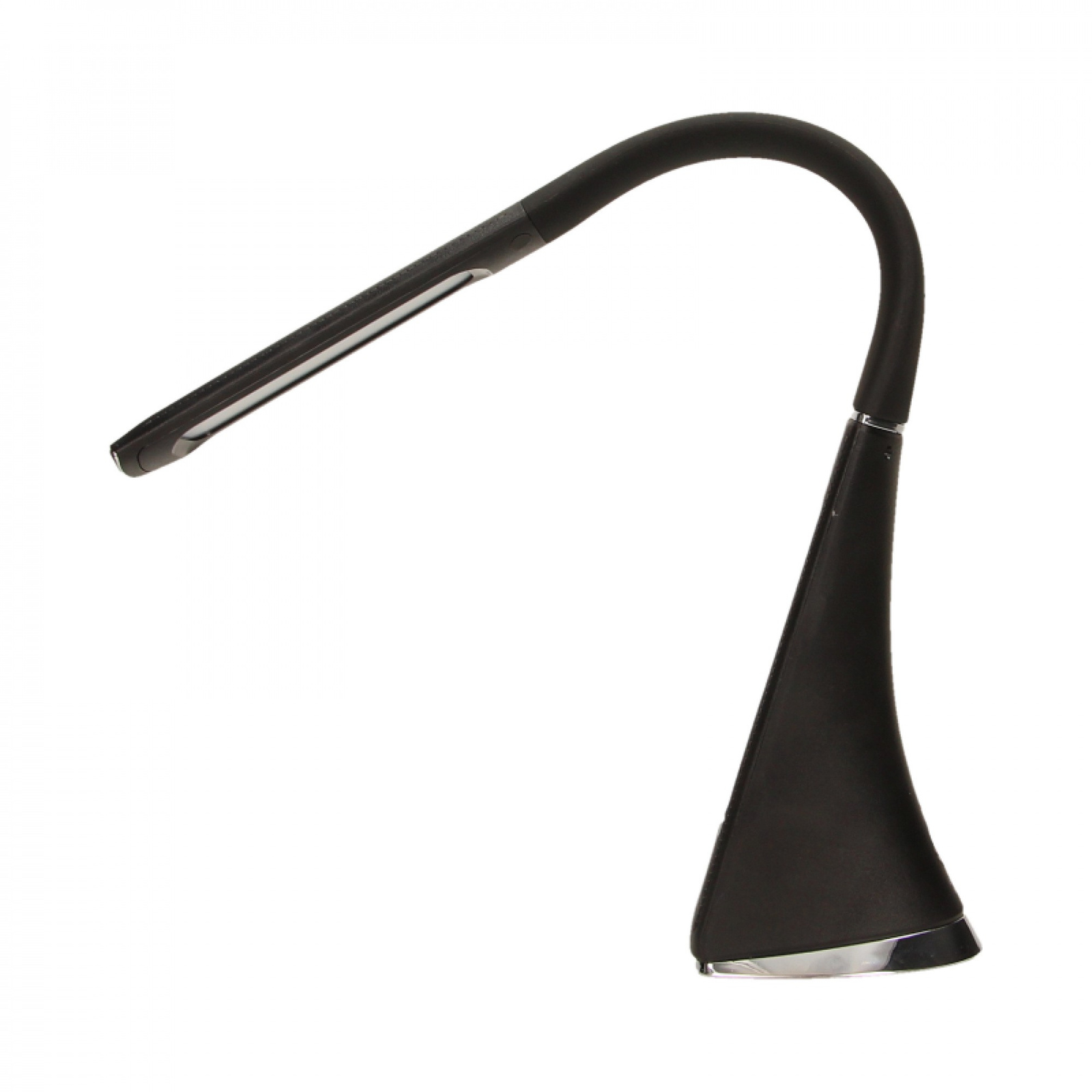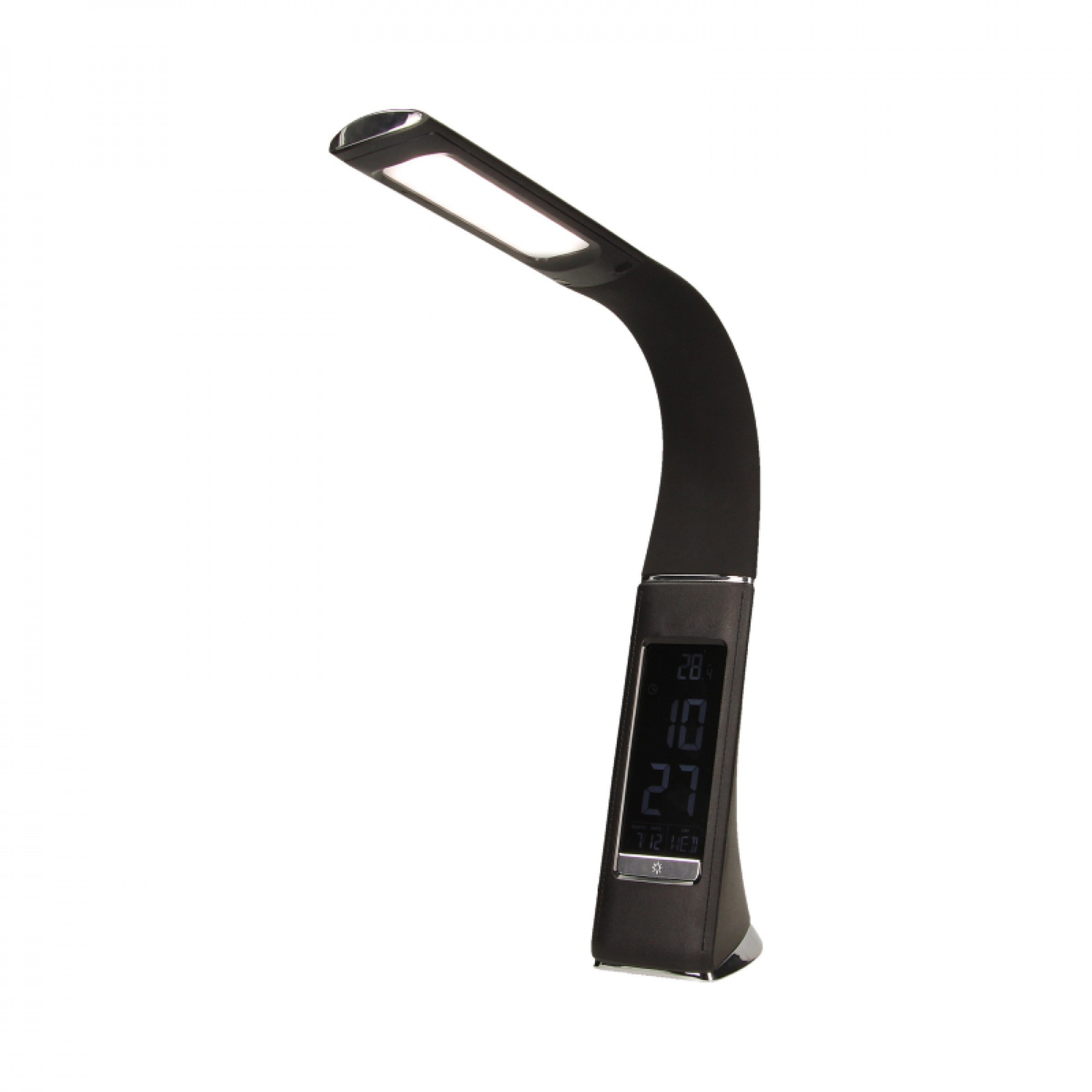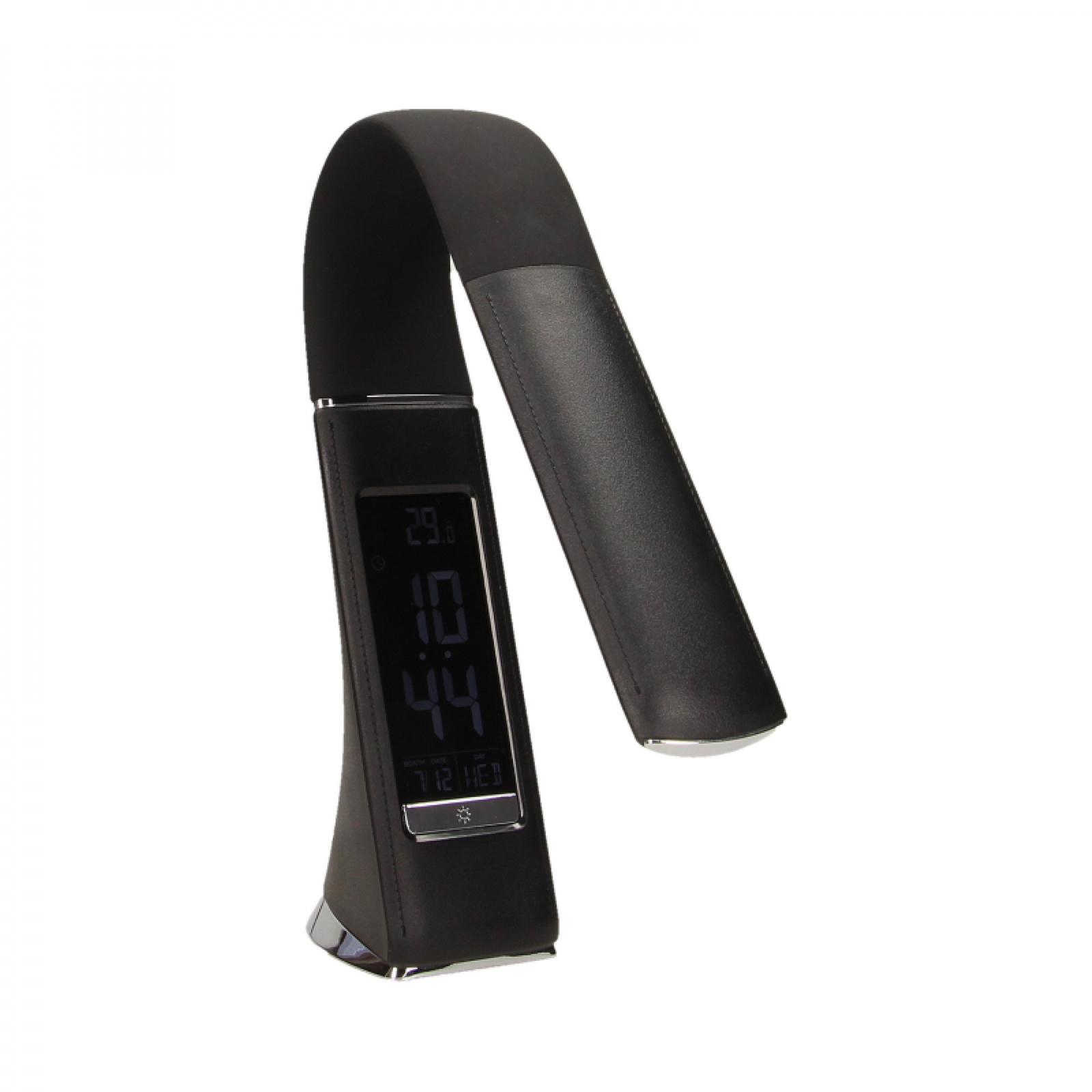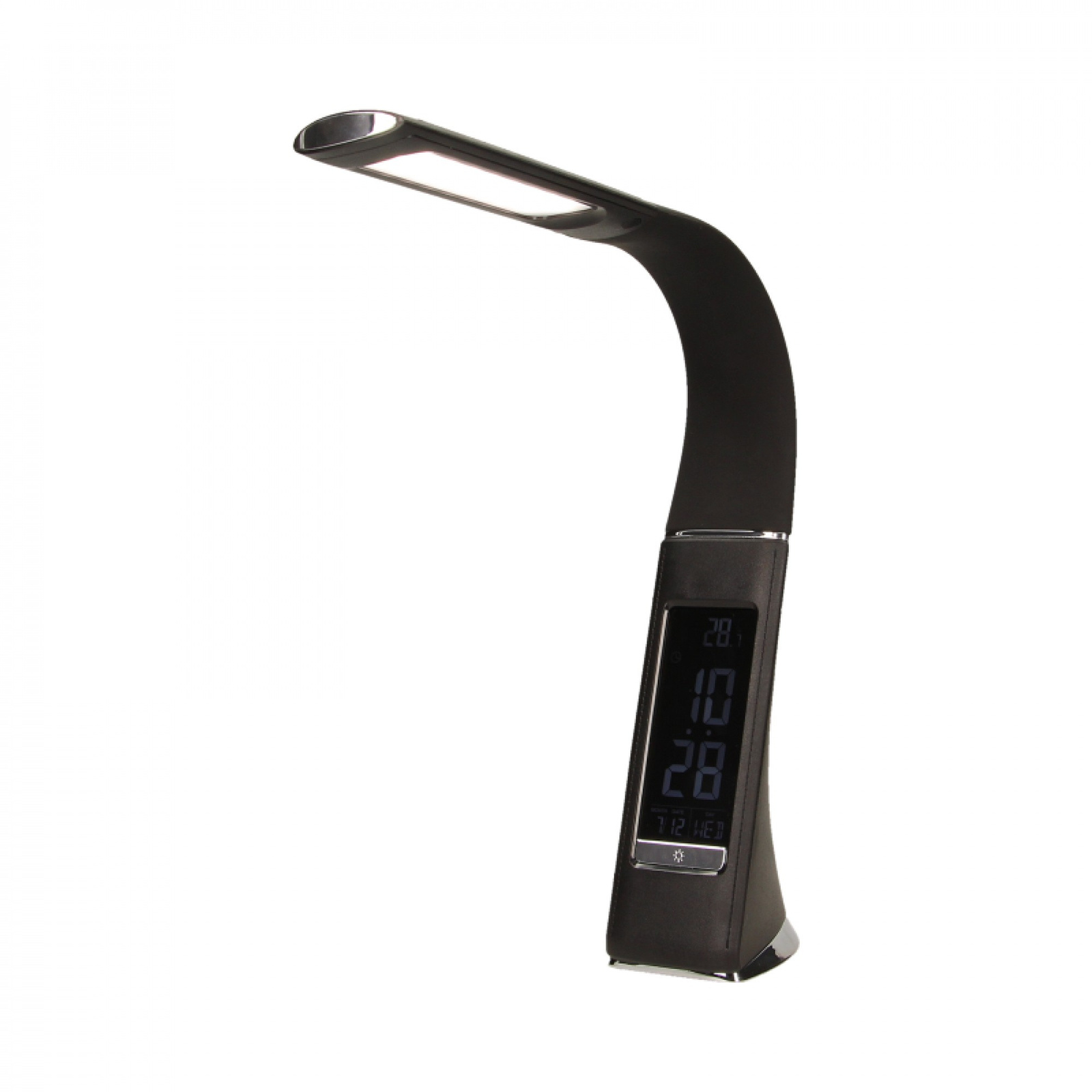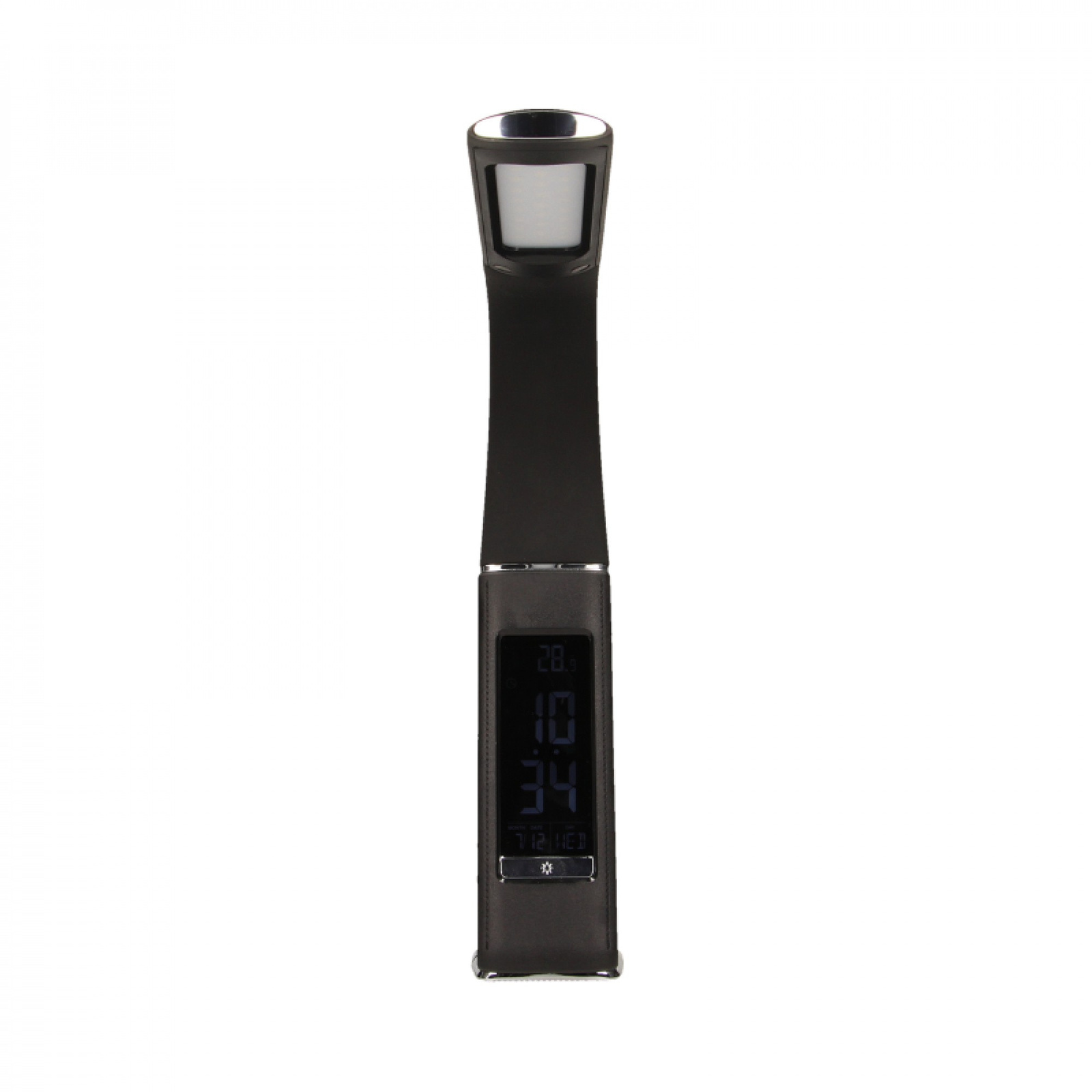 Lampka biurkowa LED z elastycznym, regulowanym ramieniem, które umożliwia wygodną regulację kierunku świecenia. Wyświetlacz LCD posiada wbudowany zegar z budzikiem, 8 dźwięków alarmu, kalendarz i termometr. Dotykowy przycisk sterujący oraz funkcja ściemniania (3 stopniowa regulacja intensywności świecenia). Dostępne kolory: czarny.