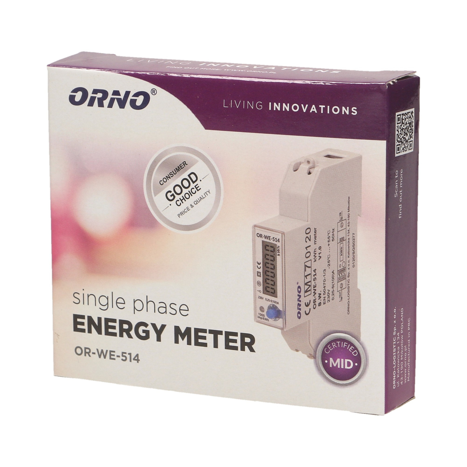 1-fazowy licznik energii elektrycznej. 100A. port RS-485. MID. 1 moduł. DIN TH-35mm OR-WE-514