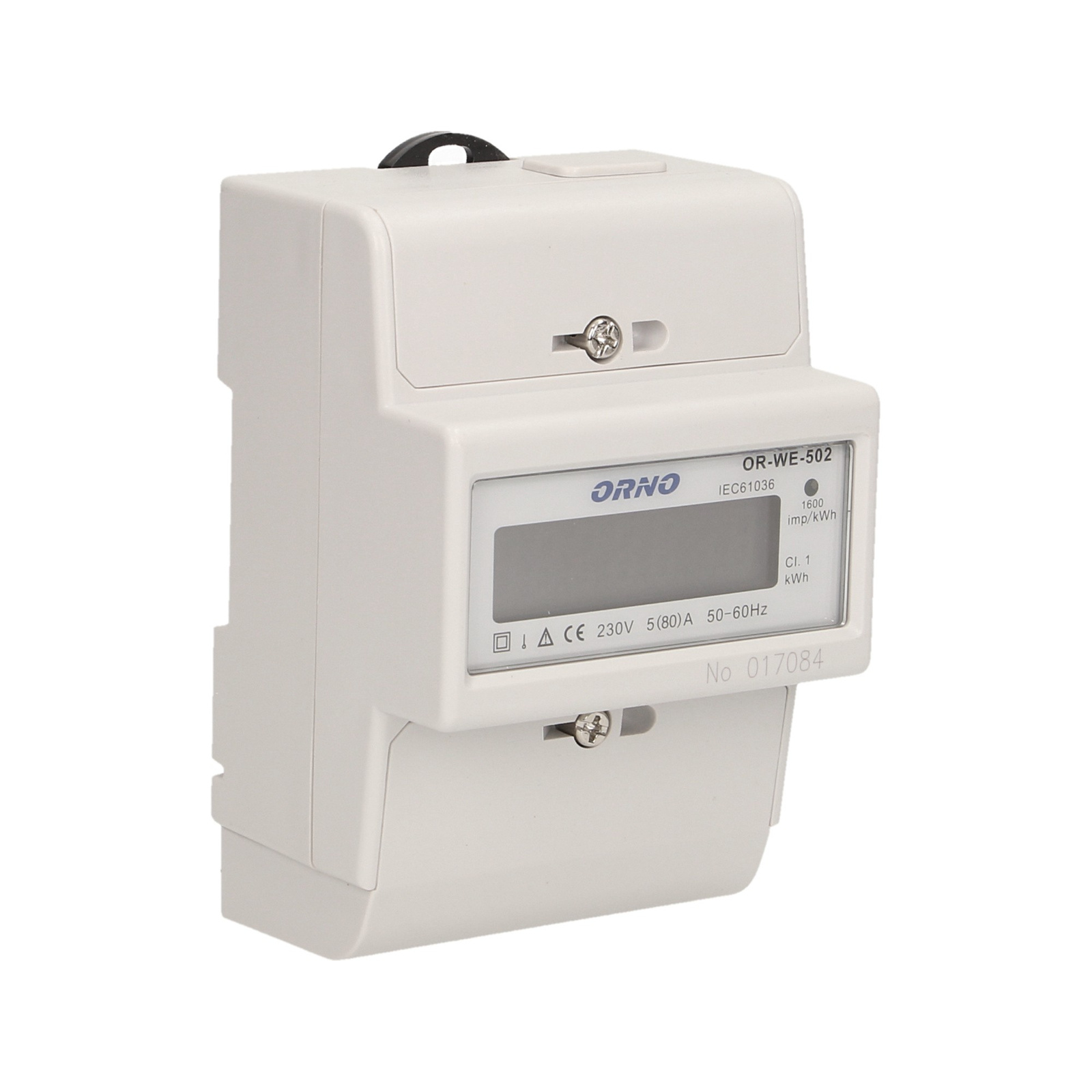 Urządzenie do dokonywania wskazań w jednostkach metrycznych (kWh), służy do bezpośredniego pomiaru mocy czynnej w układzie jednofazowym. Specjalny układ elektroniczny pod wpływem przepływającego prądu i przyłożonego napięcia generuje impulsy w ilości proporcjonalnej do pobieranej energii elektrycznej. Pobór energii w fazie sygnalizowany jest miganiem LED. Liczba impulsów jest przeliczana na energię pobraną a jej wartość wskazywana jest przez wyświetlacz LCD (6+1). Zasilanie: 230V~, 50Hz, prąd bazowy: 5A, max. prąd: 80A, częstotliwość impulsów: 1600imp/kWh, dokładność pomiaru: klasa 1, montaż na szynie 35 mm.