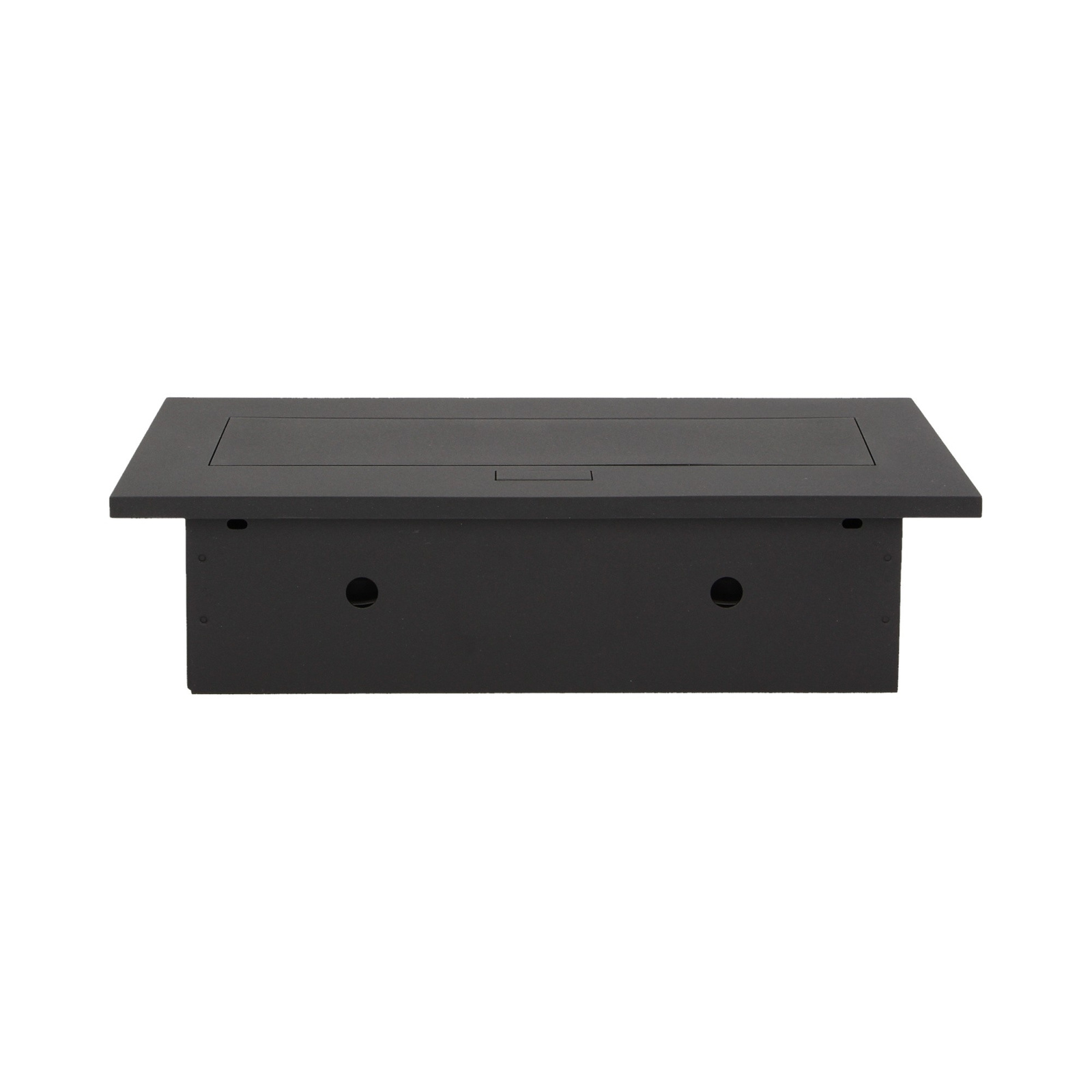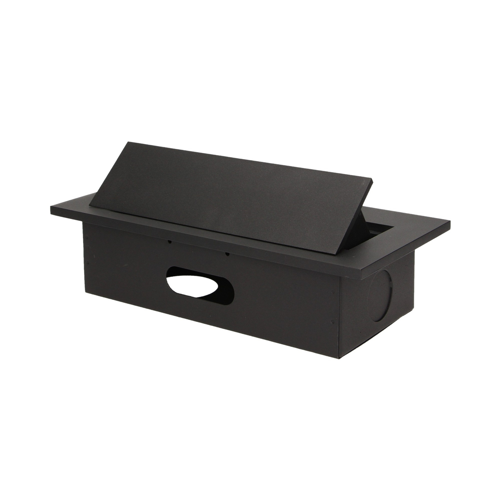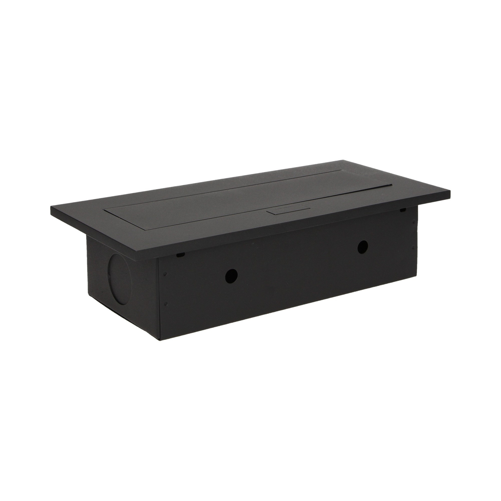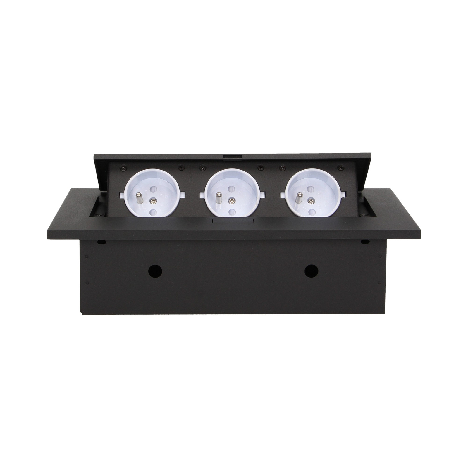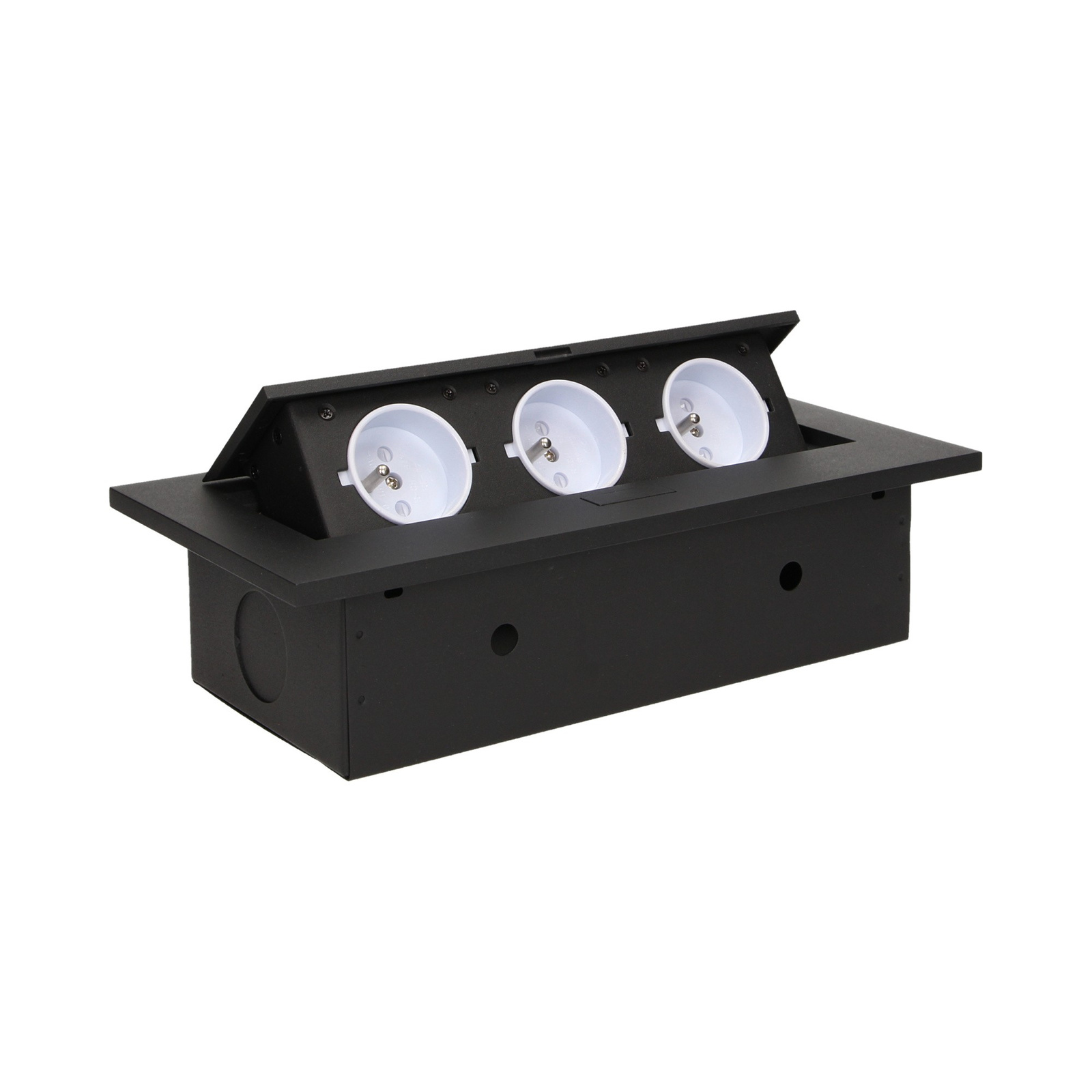 Zestaw trzech gniazd sieciowych z uziemieniem i przesłonami torów prądowych w obudowie chowanej w blat. Urządzenie przeznaczone jest do montażu w biurkach, blatach i stołach, może być zamontowane zarówno w pozycji pionowej jak i poziomej, zapewniając dostęp do gniazd elektrycznych. Zalecany przewód OWY 3 × 1,5mm² (brak w zestawie). Dostępne kolory: czarny, srebrny.