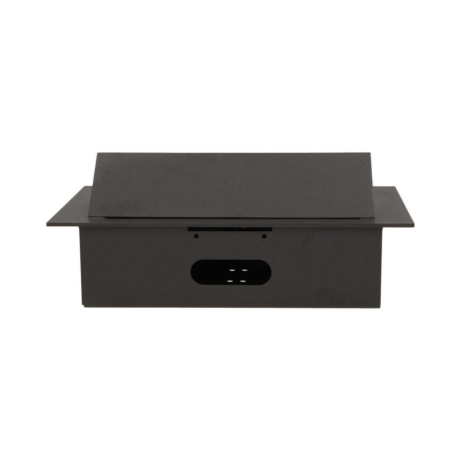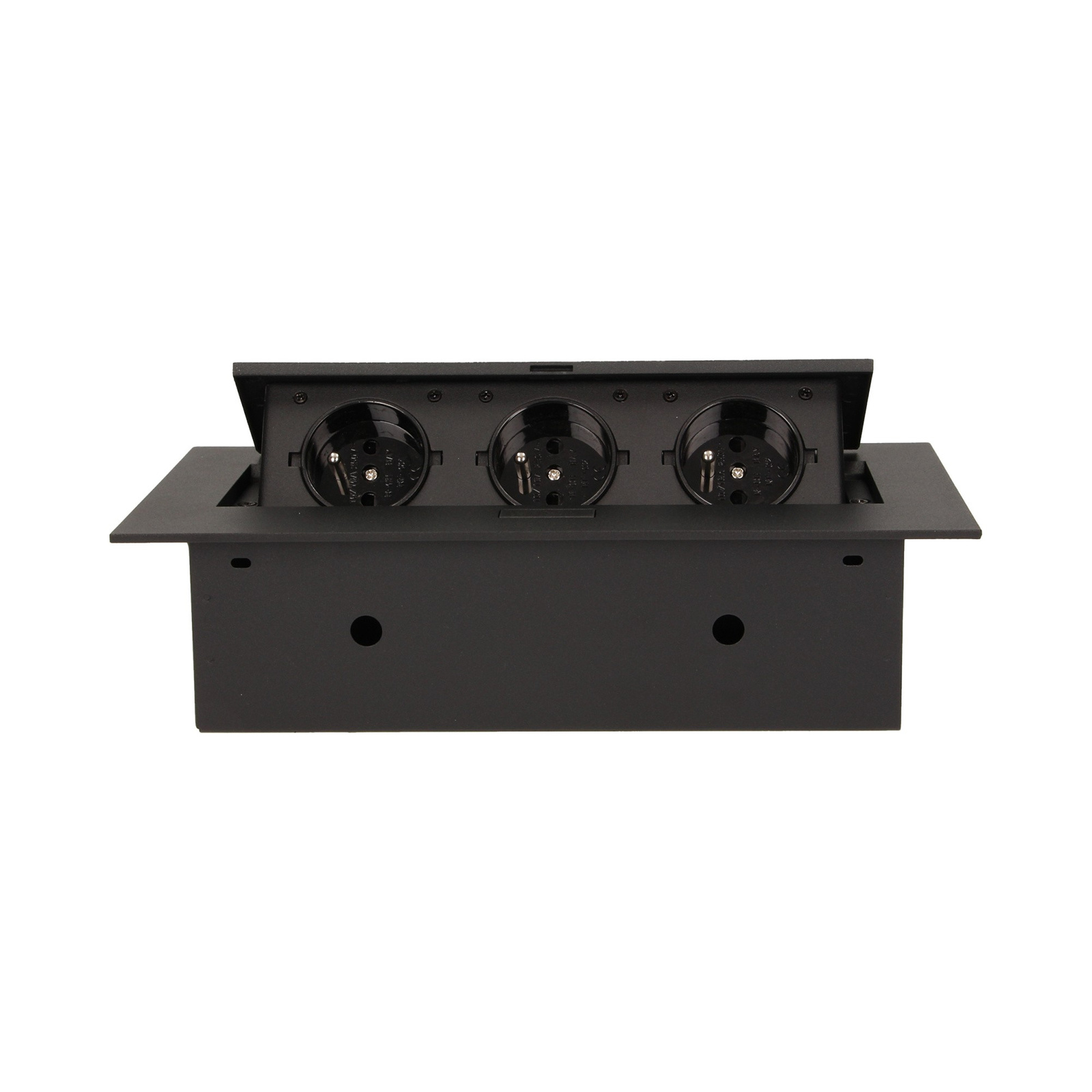 Zestaw trzech gniazd sieciowych z uziemieniem i przesłonami torów prądowych w obudowie chowanej w blat. Urządzenie przeznaczone jest do montażu w biurkach, blatach i stołach, może być zamontowane zarówno w pozycji pionowej jak i poziomej, zapewniając dostęp do gniazd elektrycznych. Zalecany przewód OWY 3 × 1,5mm² (brak w zestawie). Dostępne kolory: czarny, srebrny.