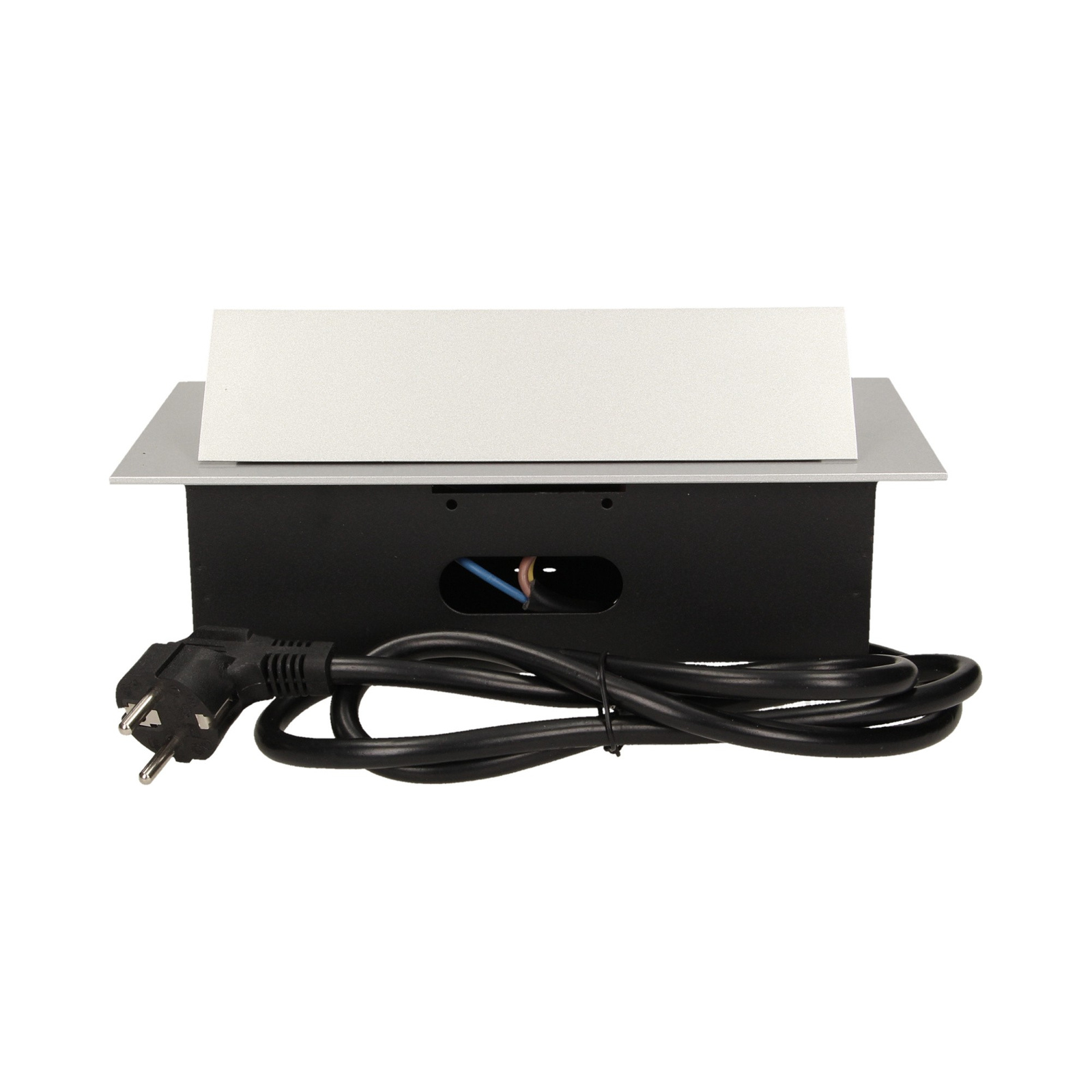 Zestaw trzech gniazd sieciowych z uziemieniem i przesłonami torów prądowych w obudowie chowanej w blat. Urządzenie przeznaczone jest do montażu w biurkach, blatach i stołach, może być zamontowane zarówno w pozycji pionowej jak i poziomej, zapewniając dostęp do gniazd elektrycznych. Posiada zamykany panel z gniazdami sieciowymi oraz przewód o długości 1,5 m. Dostępne kolory: czarny, srebrny.