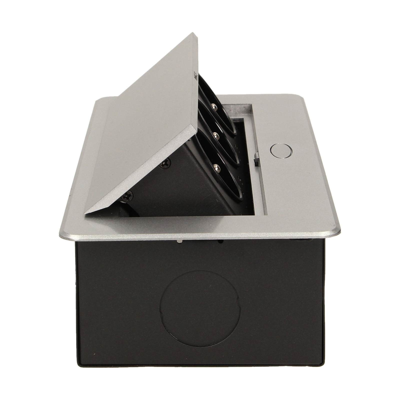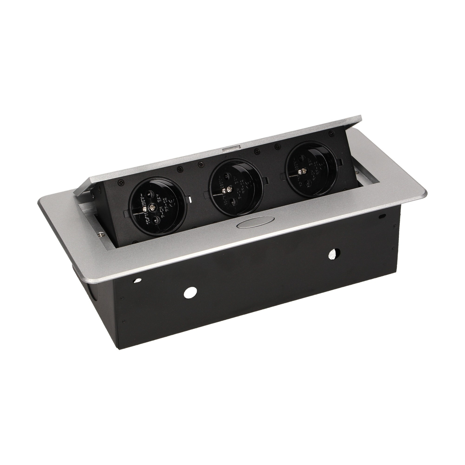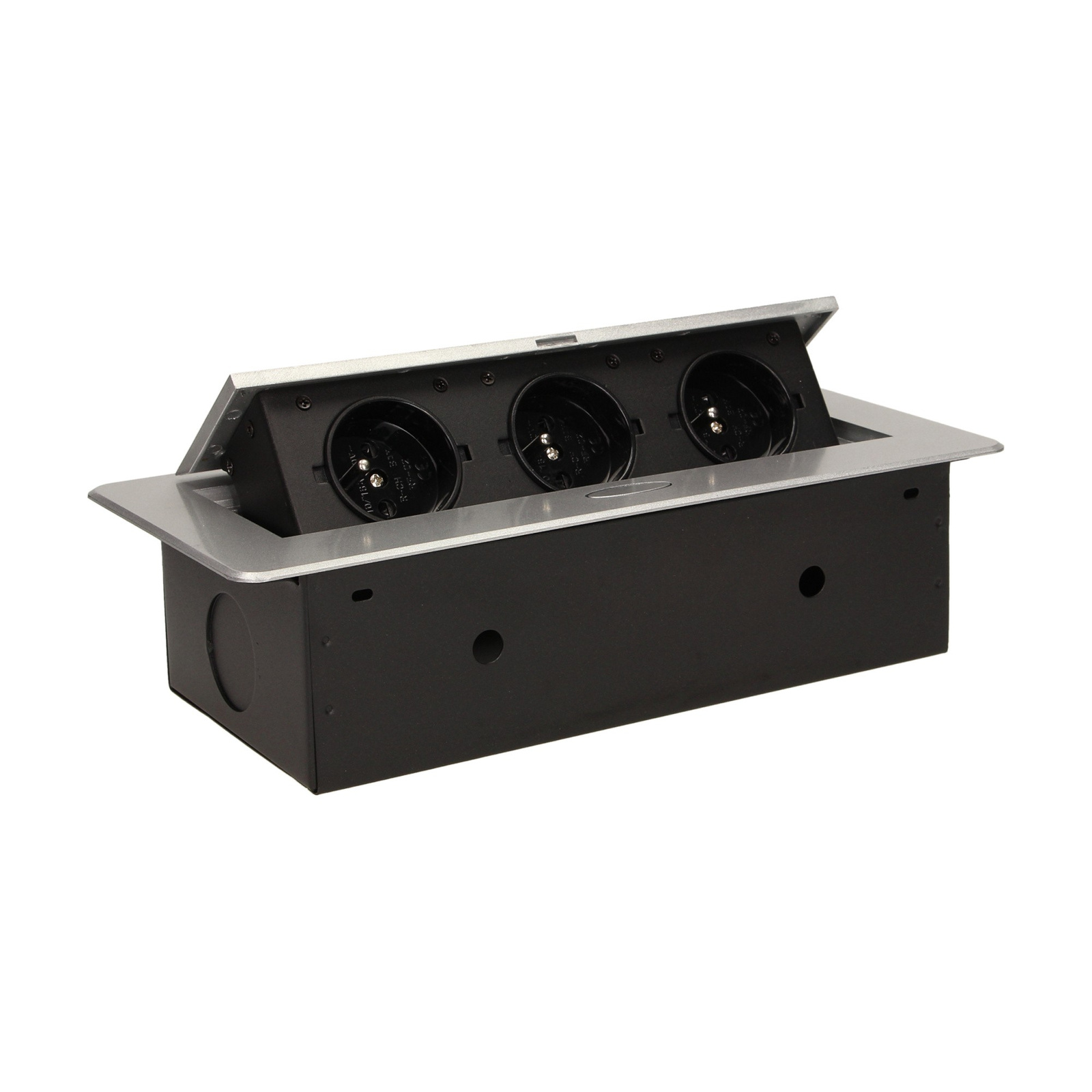 Zestaw trzech gniazd sieciowych z uziemieniem i przesłonami torów prądowych w obudowie chowanej w blat. Urządzenie przeznaczone jest do montażu w biurkach, blatach i stołach, może być zamontowane zarówno w pozycji pionowej jak i poziomej, zapewniając dostęp do gniazd elektrycznych. Zalecany przewód OWY 3 × 1,5 mm² (brak w zestawie). Dostępne kolory: czarny, srebrny, złoty, mosiądz, grafit.