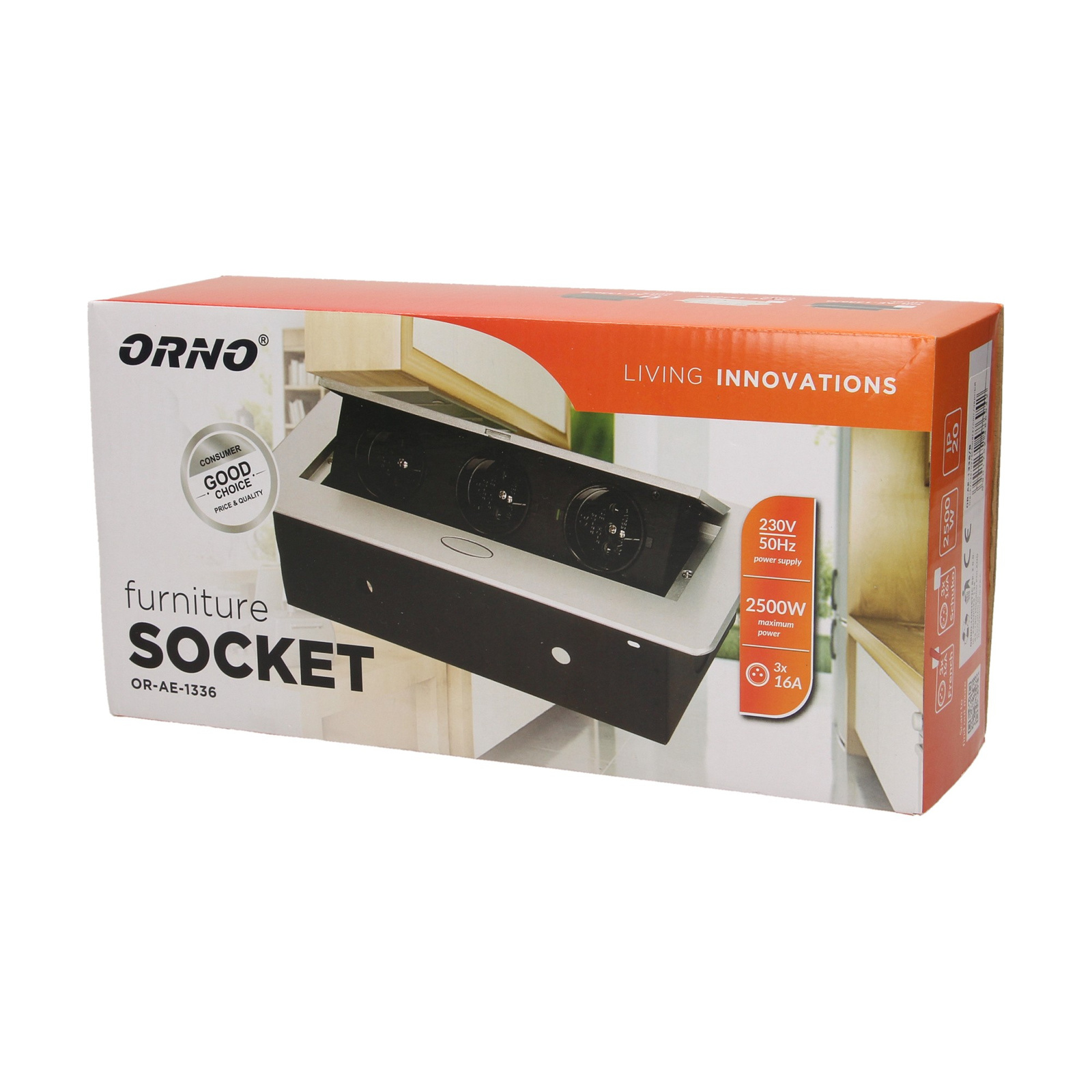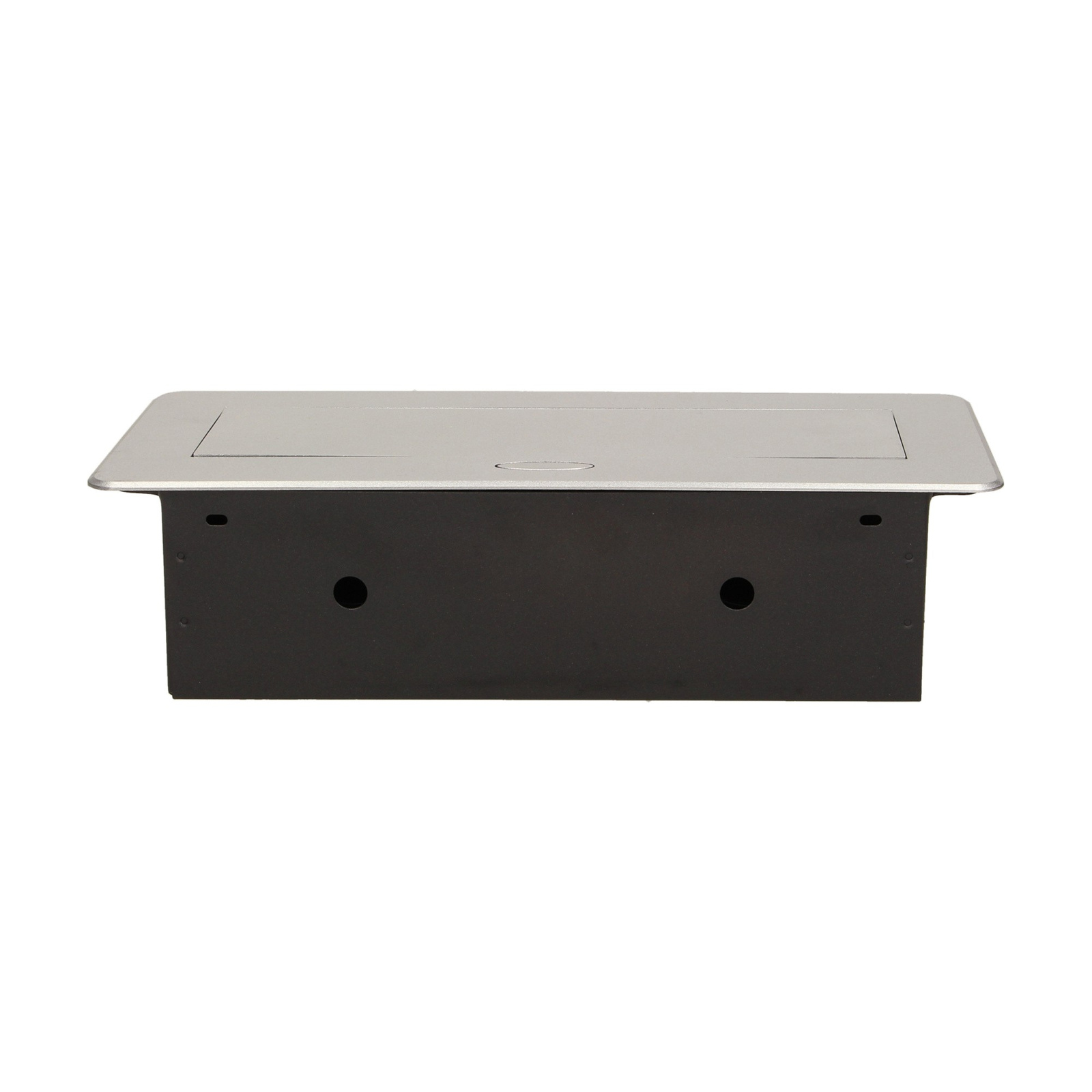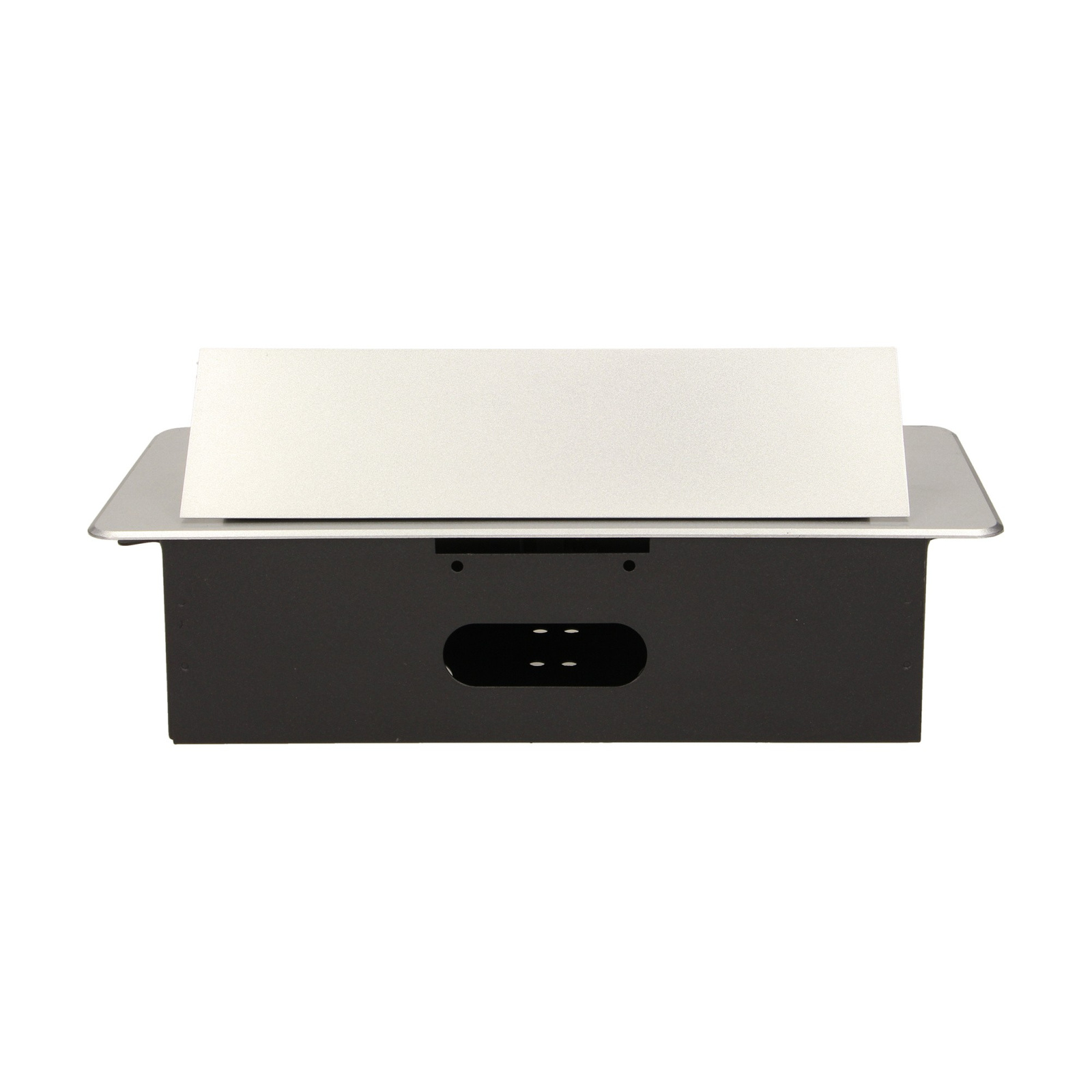 Zestaw trzech gniazd sieciowych z uziemieniem i przesłonami torów prądowych w obudowie chowanej w blat. Urządzenie przeznaczone jest do montażu w biurkach, blatach i stołach, może być zamontowane zarówno w pozycji pionowej jak i poziomej, zapewniając dostęp do gniazd elektrycznych. Zalecany przewód OWY 3 × 1,5 mm² (brak w zestawie). Dostępne kolory: czarny, srebrny, złoty, mosiądz, grafit.