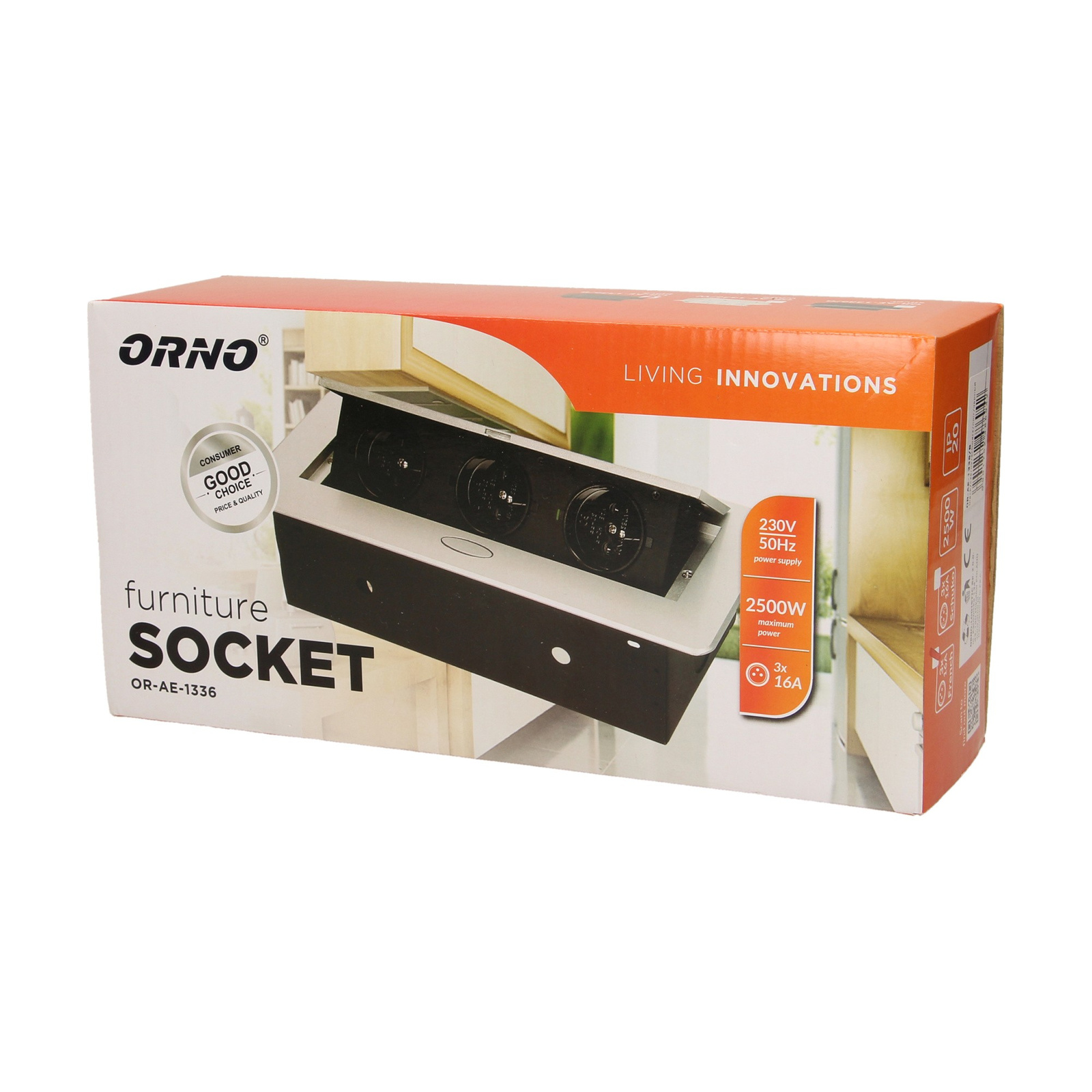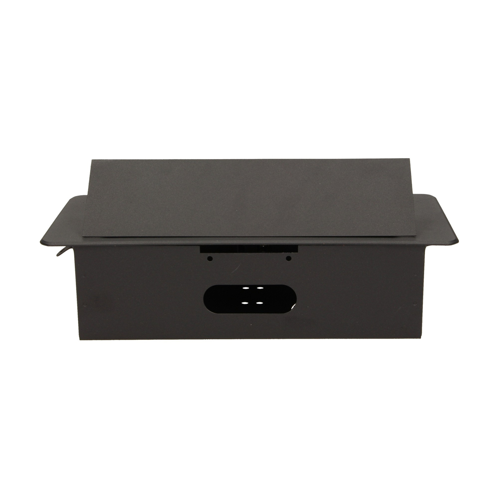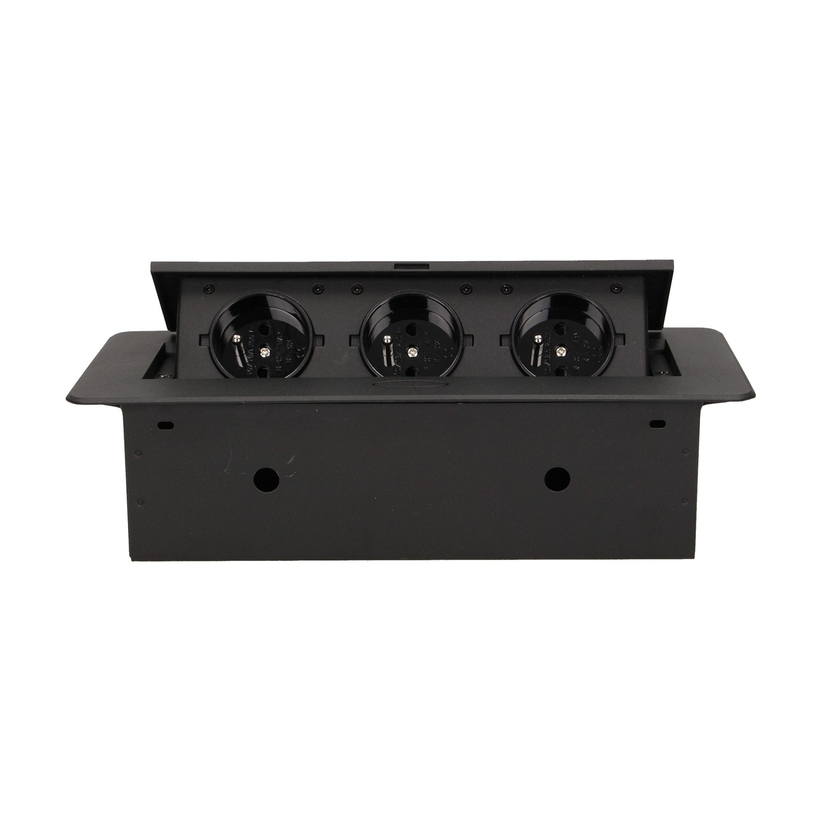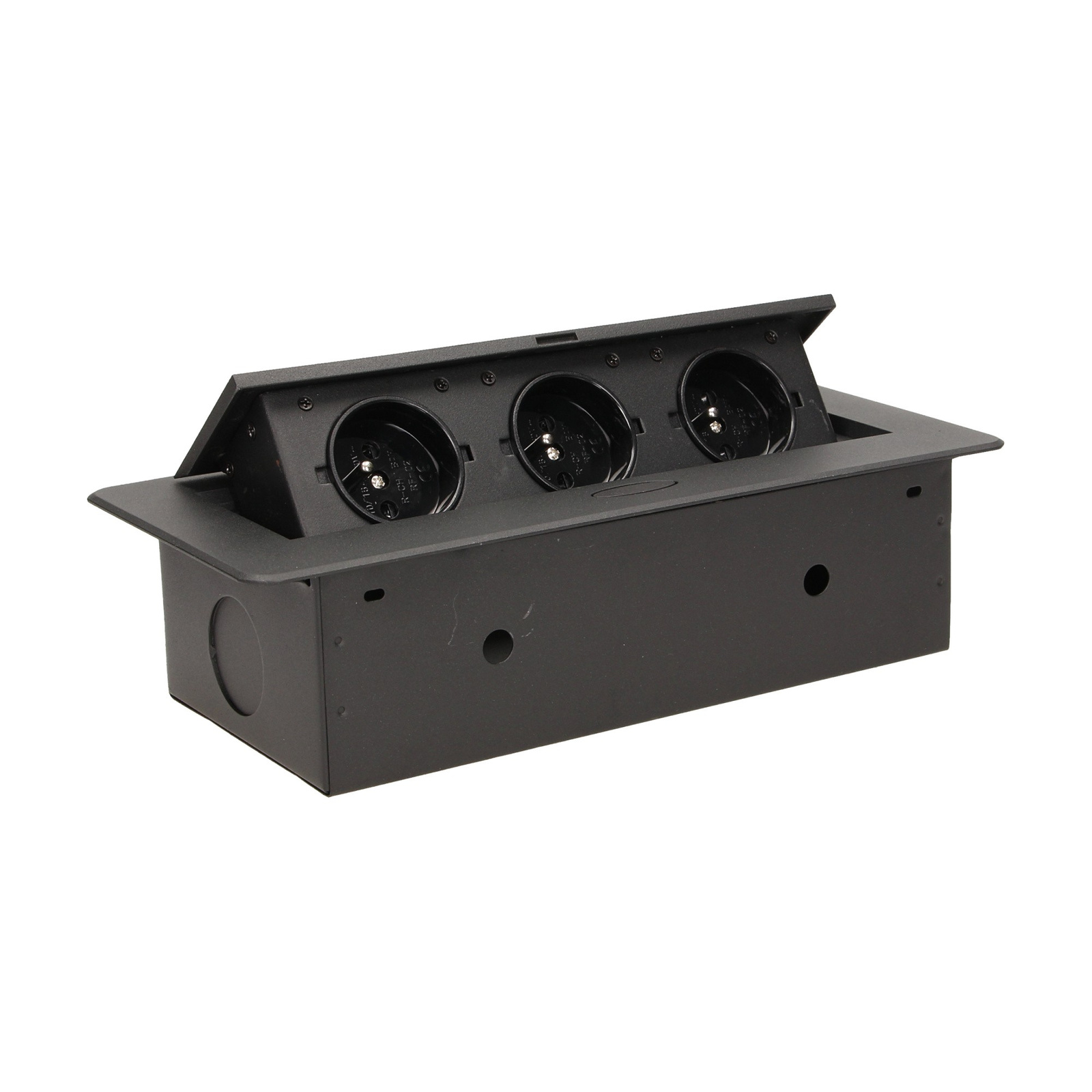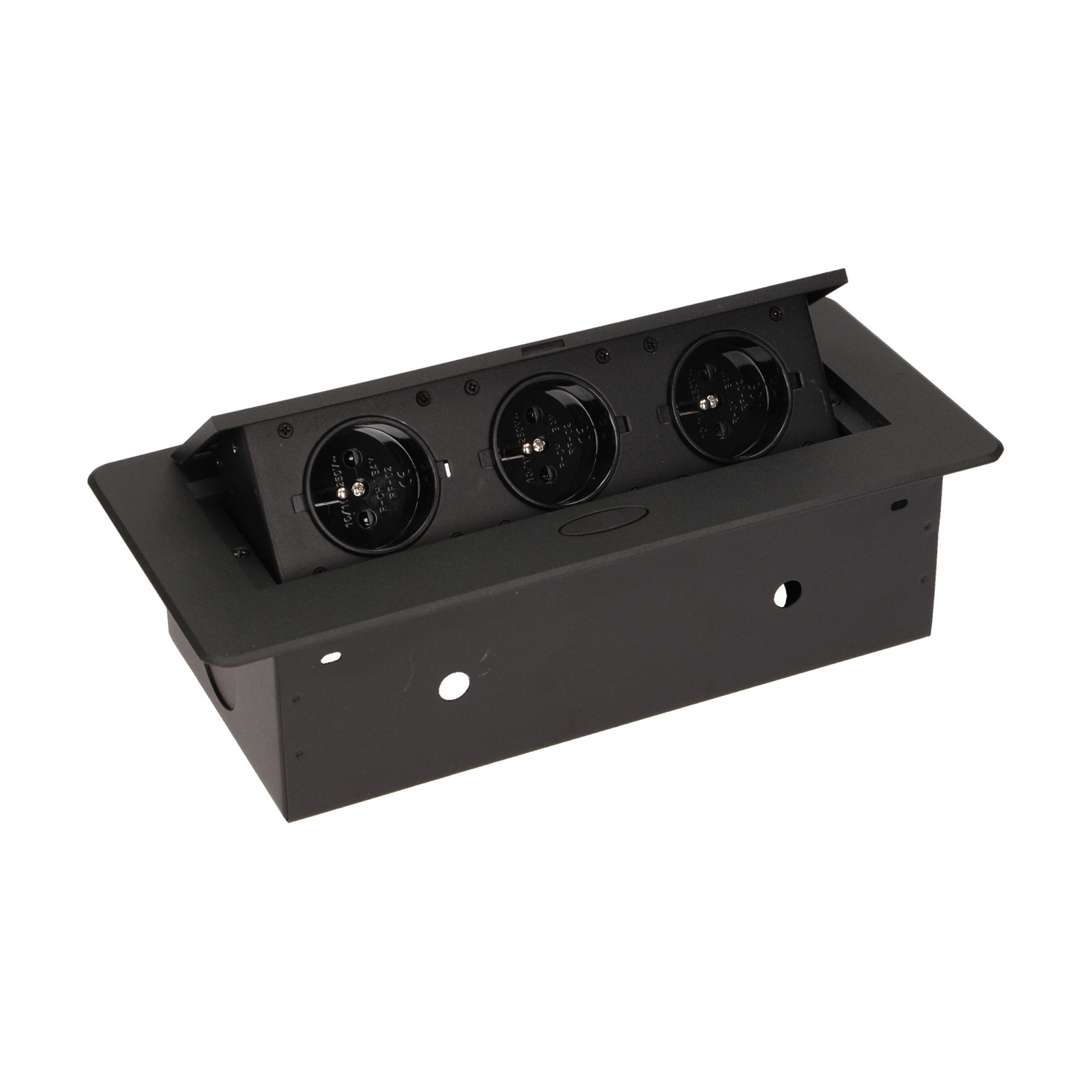 Zestaw trzech gniazd sieciowych z uziemieniem i przesłonami torów prądowych w obudowie chowanej w blat. Urządzenie przeznaczone jest do montażu w biurkach, blatach i stołach, może być zamontowane zarówno w pozycji pionowej jak i poziomej, zapewniając dostęp do gniazd elektrycznych. Zalecany przewód OWY 3 × 1,5 mm² (brak w zestawie). Dostępne kolory: czarny, srebrny, złoty, mosiądz, grafit.