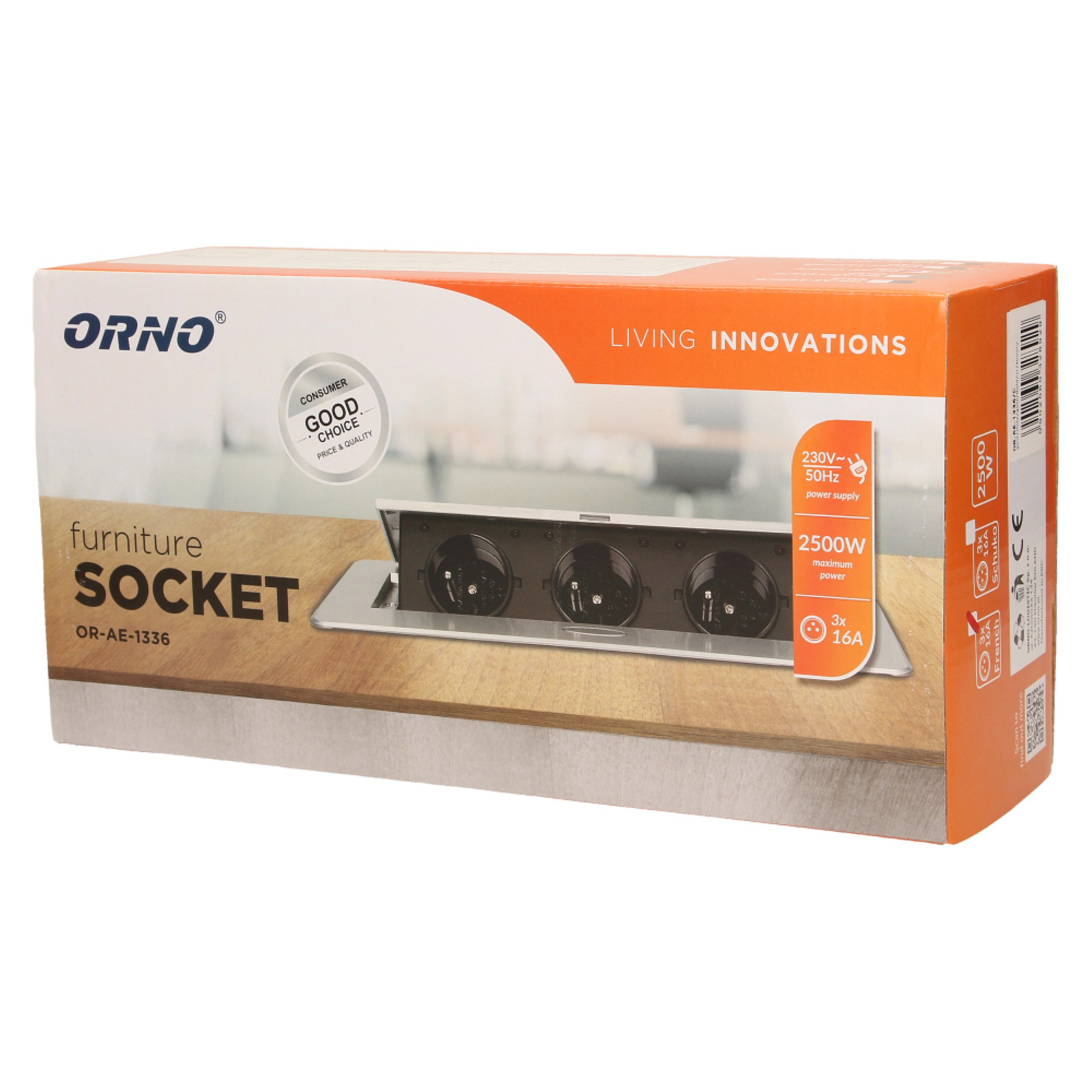 Zestaw trzech gniazd sieciowych z uziemieniem i przesłonami torów prądowych w obudowie chowanej w blat. Urządzenie przeznaczone jest do montażu w biurkach, blatach i stołach, może być zamontowane zarówno w pozycji pionowej jak i poziomej, zapewniając dostęp do gniazd elektrycznych. Zalecany przewód OWY 3 × 1,5 mm² (brak w zestawie). Dostępne kolory: czarny, srebrny, złoty, mosiądz, grafit.