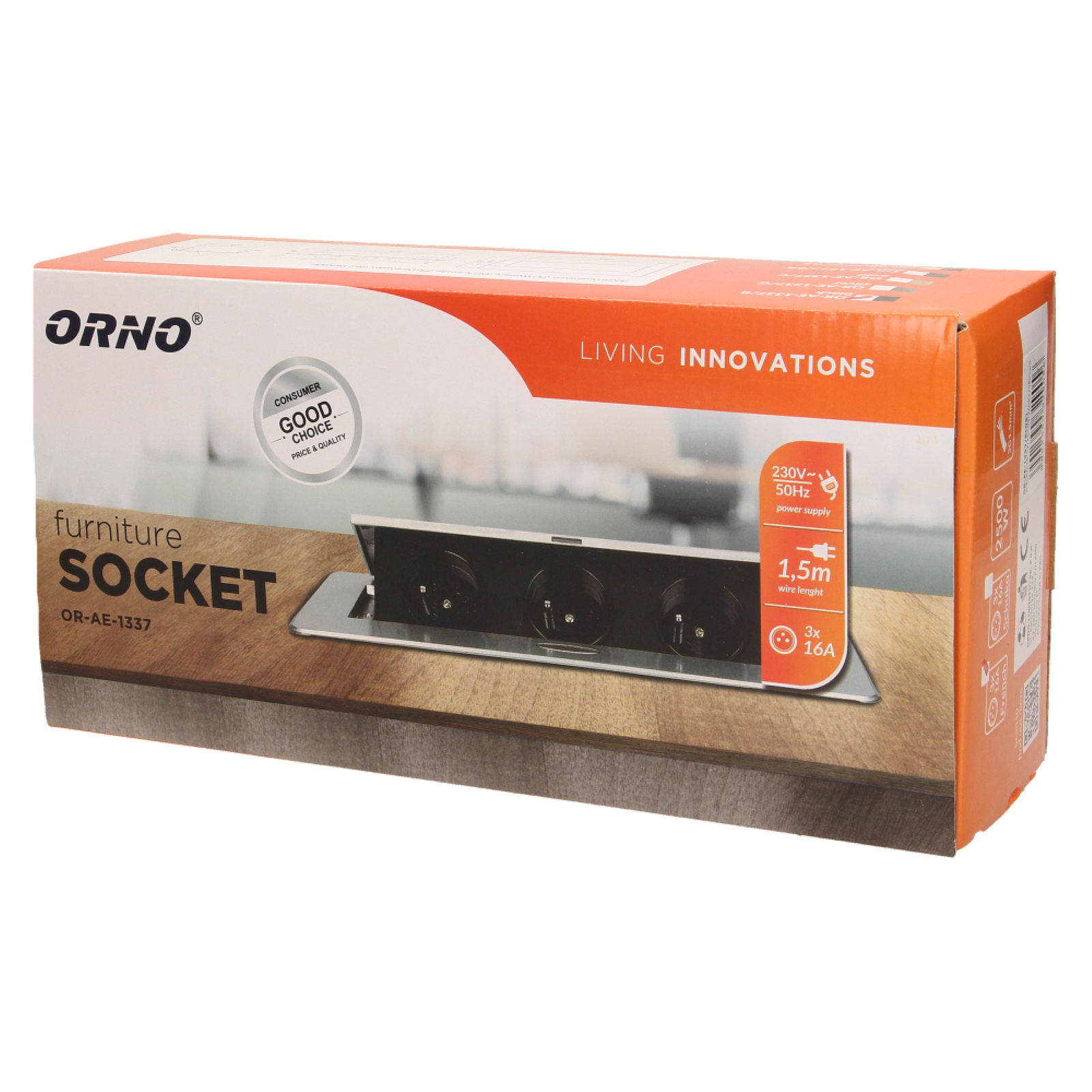 Zestaw trzech gniazd sieciowych z uziemieniem i przesłonami torów prądowych w obudowie chowanej w blat. Urządzenie przeznaczone jest do montażu w biurkach, blatach i stołach, może być zamontowane zarówno w pozycji pionowej jak i poziomej, zapewniając dostęp do gniazd elektrycznych. Posiada zamykany panel z gniazdami sieciowymi oraz przewód o długości 1,5 m. Dostępne kolory: czarny, srebrny, złoty, mosiądz, grafit.