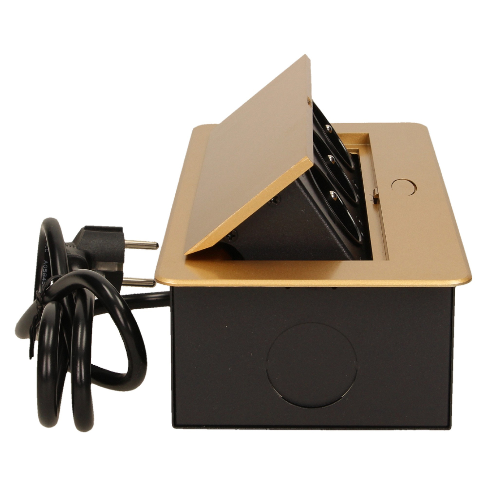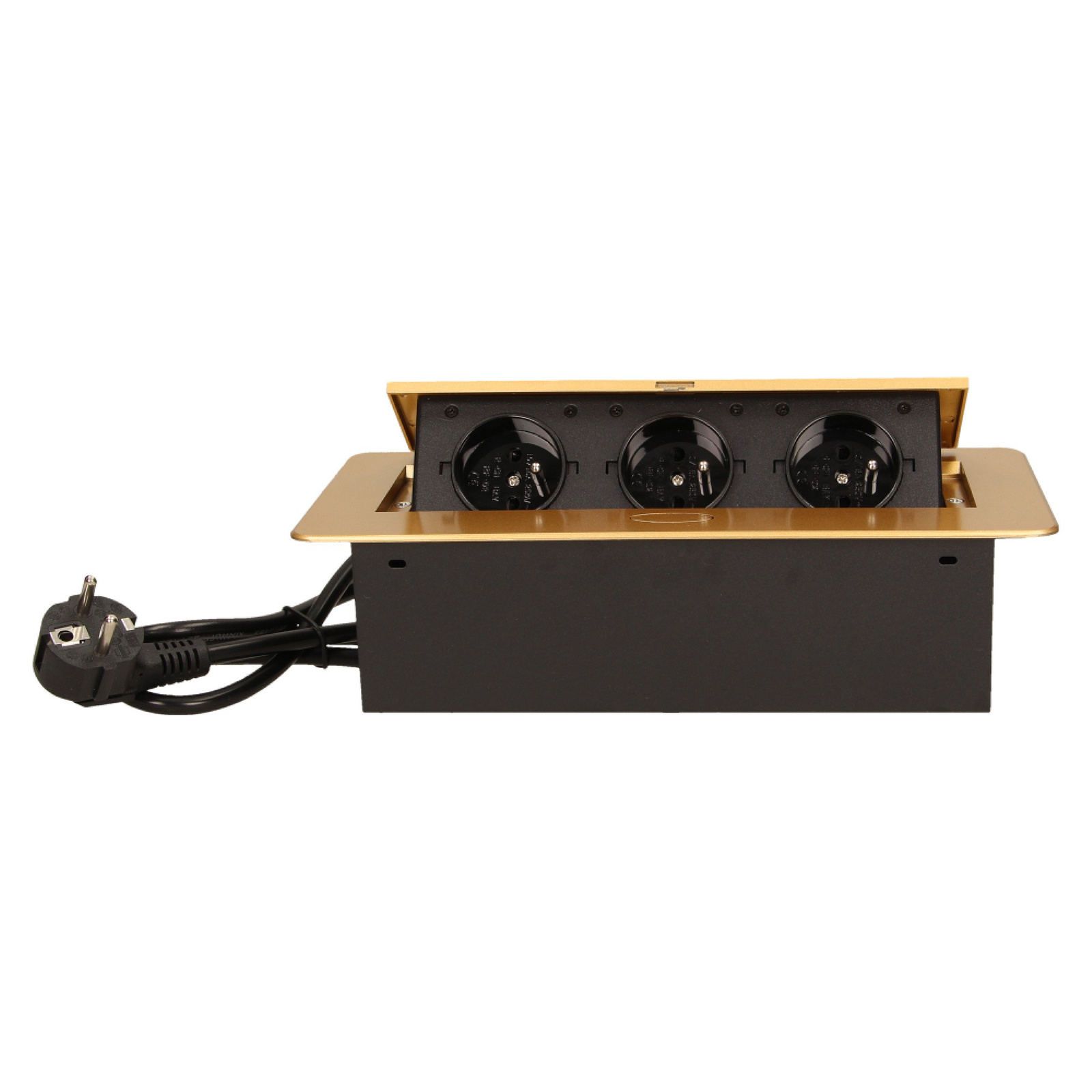 Gniazdo meblowe wpuszczane w blat z płaskim frezowanym rantem i przewodem 1,5m, 3x2P+Z, złote