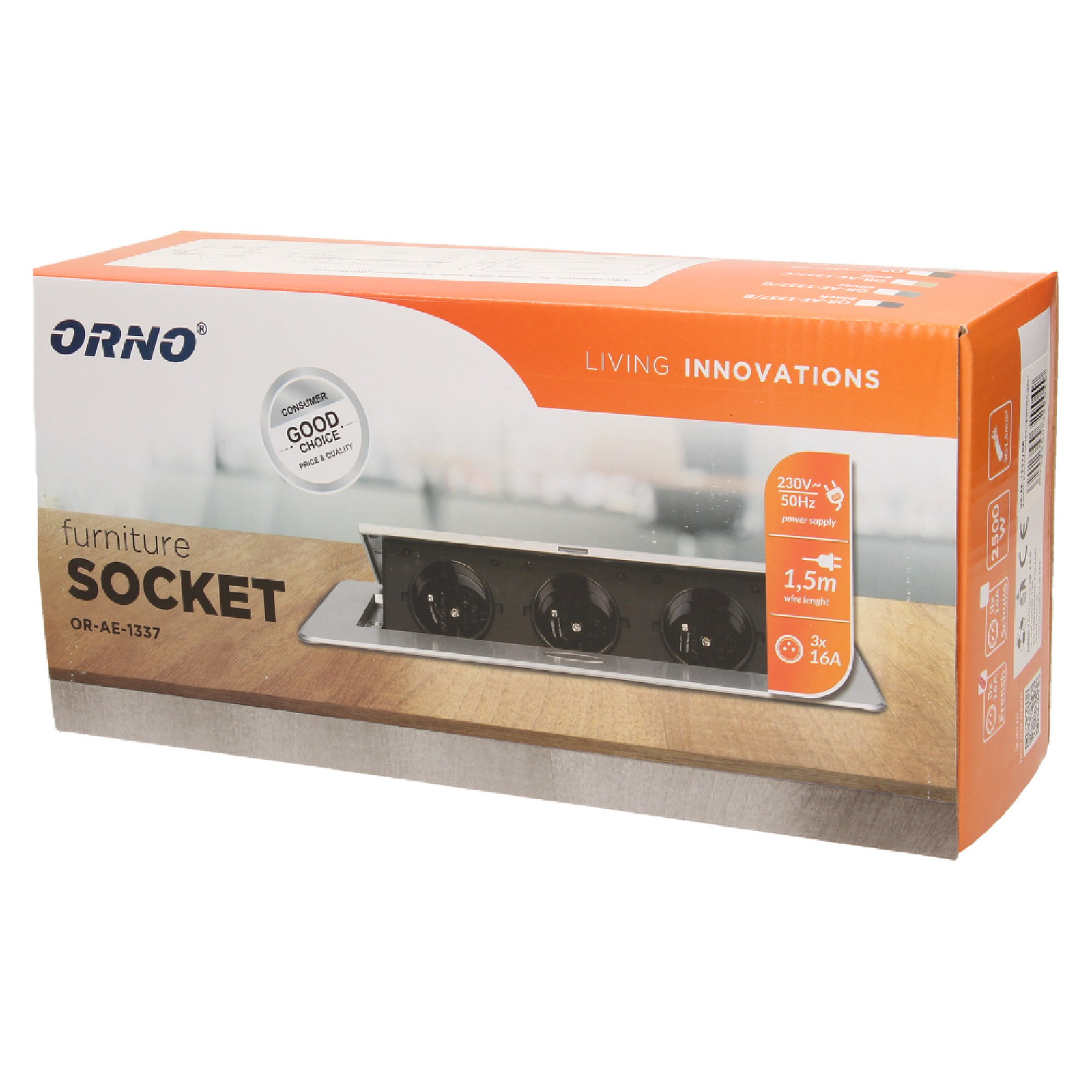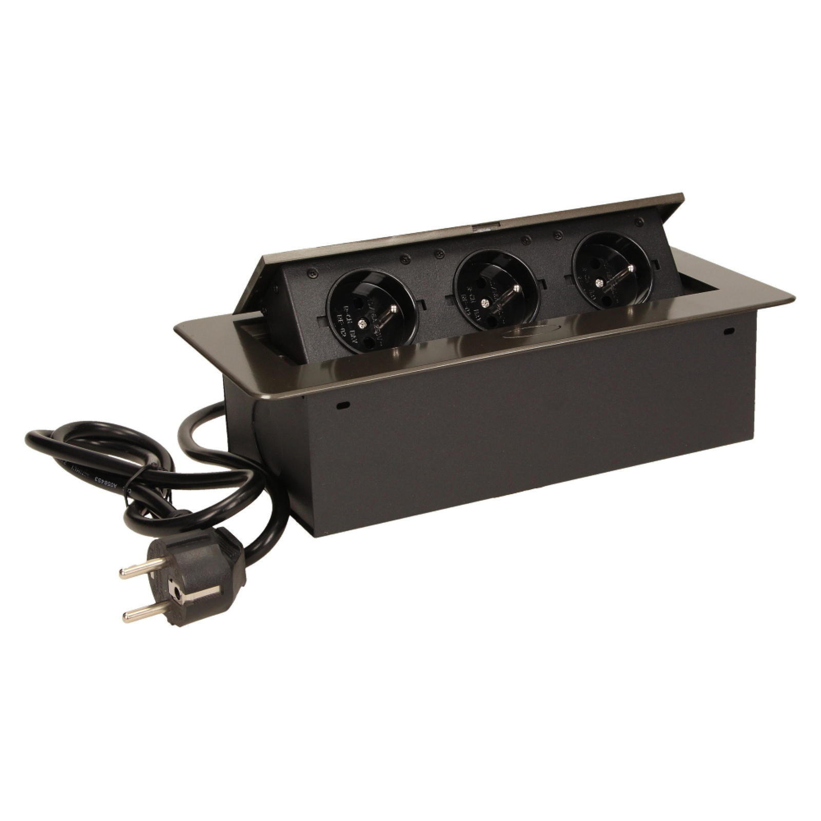 Zestaw trzech gniazd sieciowych z uziemieniem i przesłonami torów prądowych w obudowie chowanej w blat. Urządzenie przeznaczone jest do montażu w biurkach, blatach i stołach, może być zamontowane zarówno w pozycji pionowej jak i poziomej, zapewniając dostęp do gniazd elektrycznych. Posiada zamykany panel z gniazdami sieciowymi oraz przewód o długości 1,5 m. Dostępne kolory: czarny, srebrny, złoty, mosiądz, grafit.