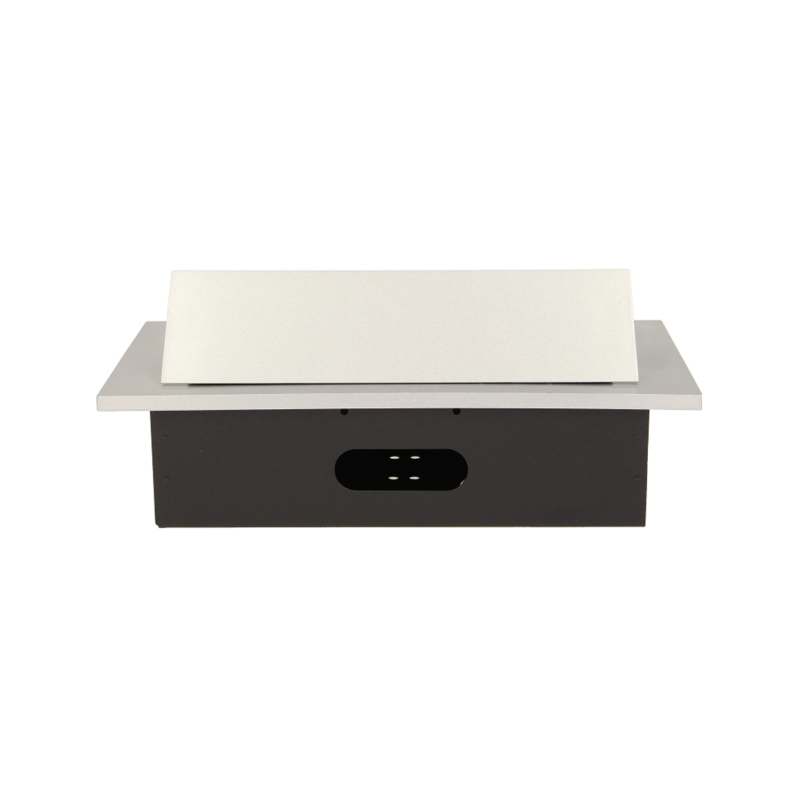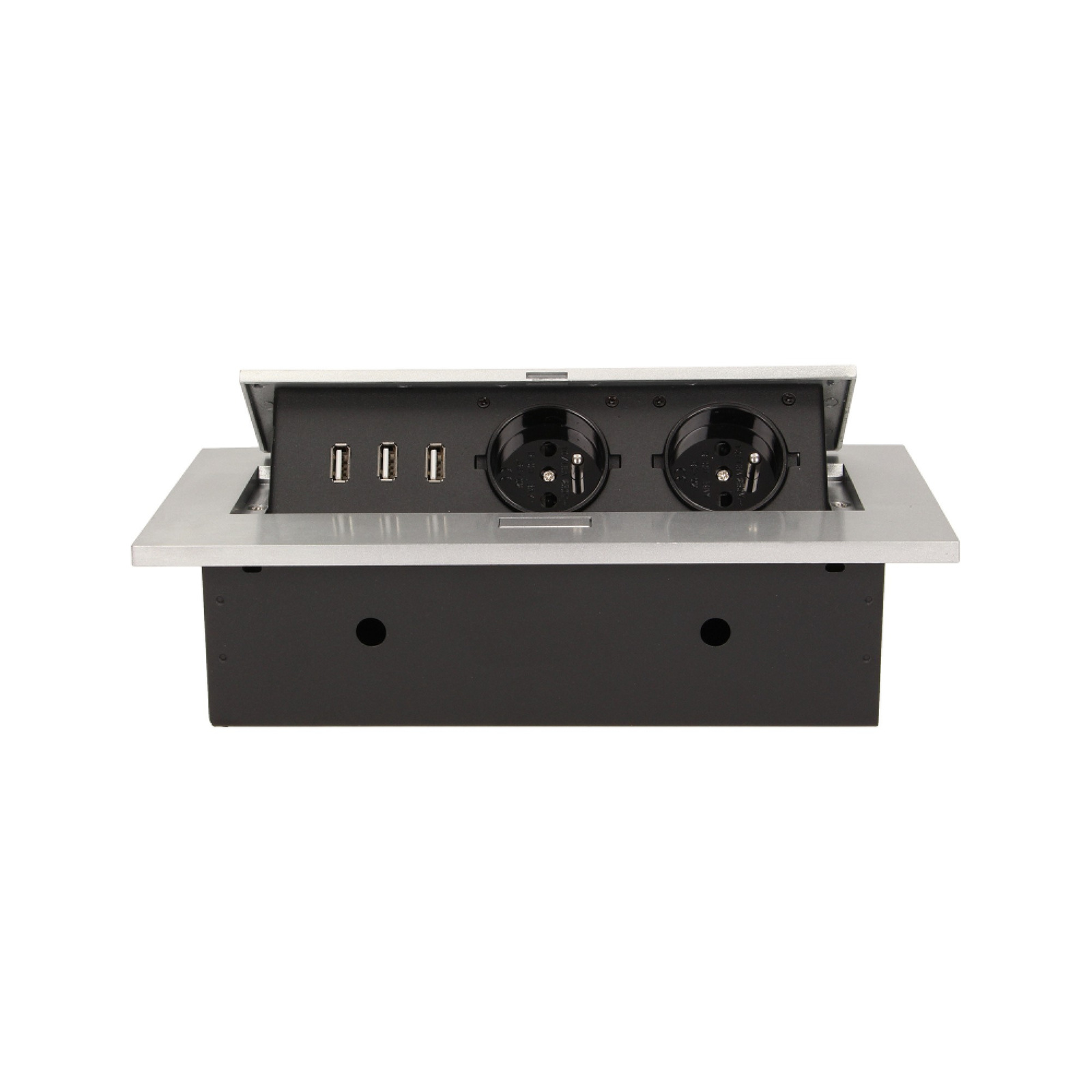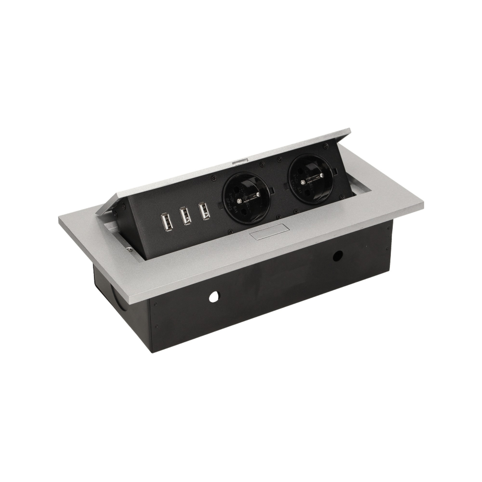 Zestaw dwóch gniazd sieciowych z uziemieniem i przesłonami torów prądowych oraz trzech portów USB (bez zasilacza) w obudowie chowanej w blat. Urządzenie przeznaczone jest do montażu w biurkach, blatach i stołach, może być zamontowane zarówno w pozycji pionowej jak i poziomej, zapewniając dostęp do gniazd elektrycznych. Zalecany przewód OWY 3 × 1,5mm² (brak w zestawie). Dostępne kolory: czarny, srebrny.