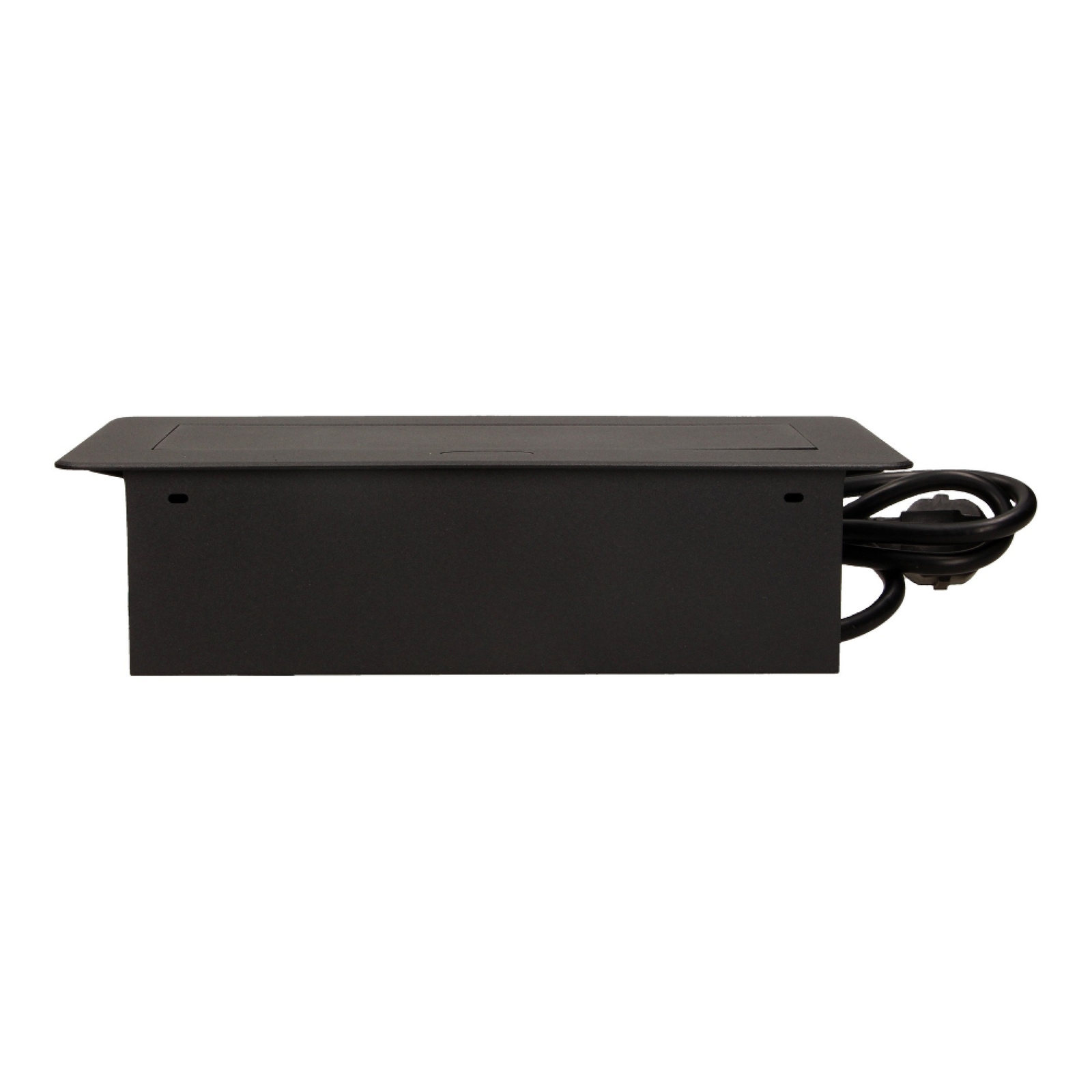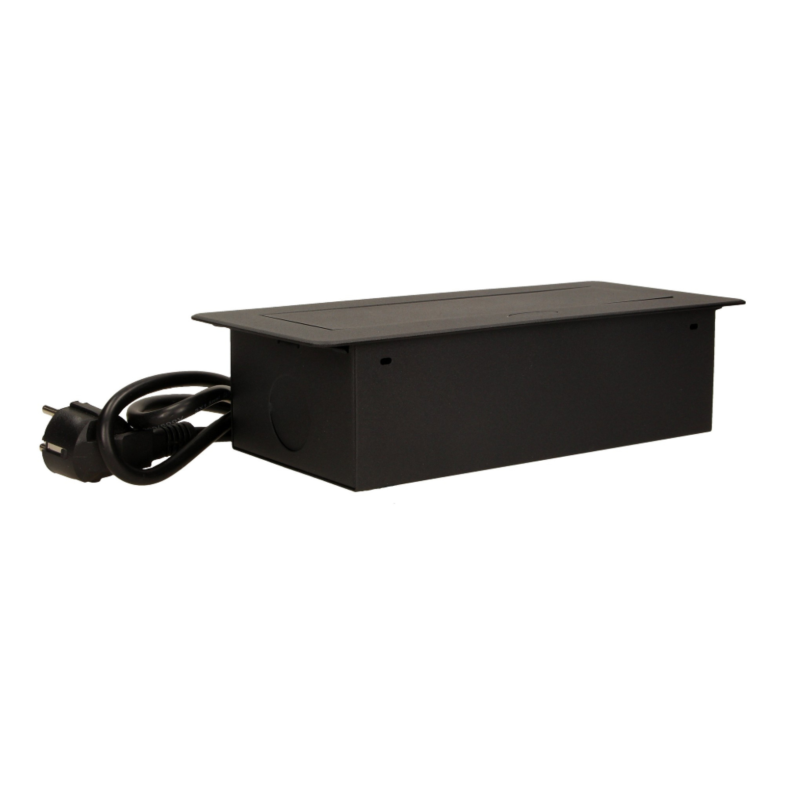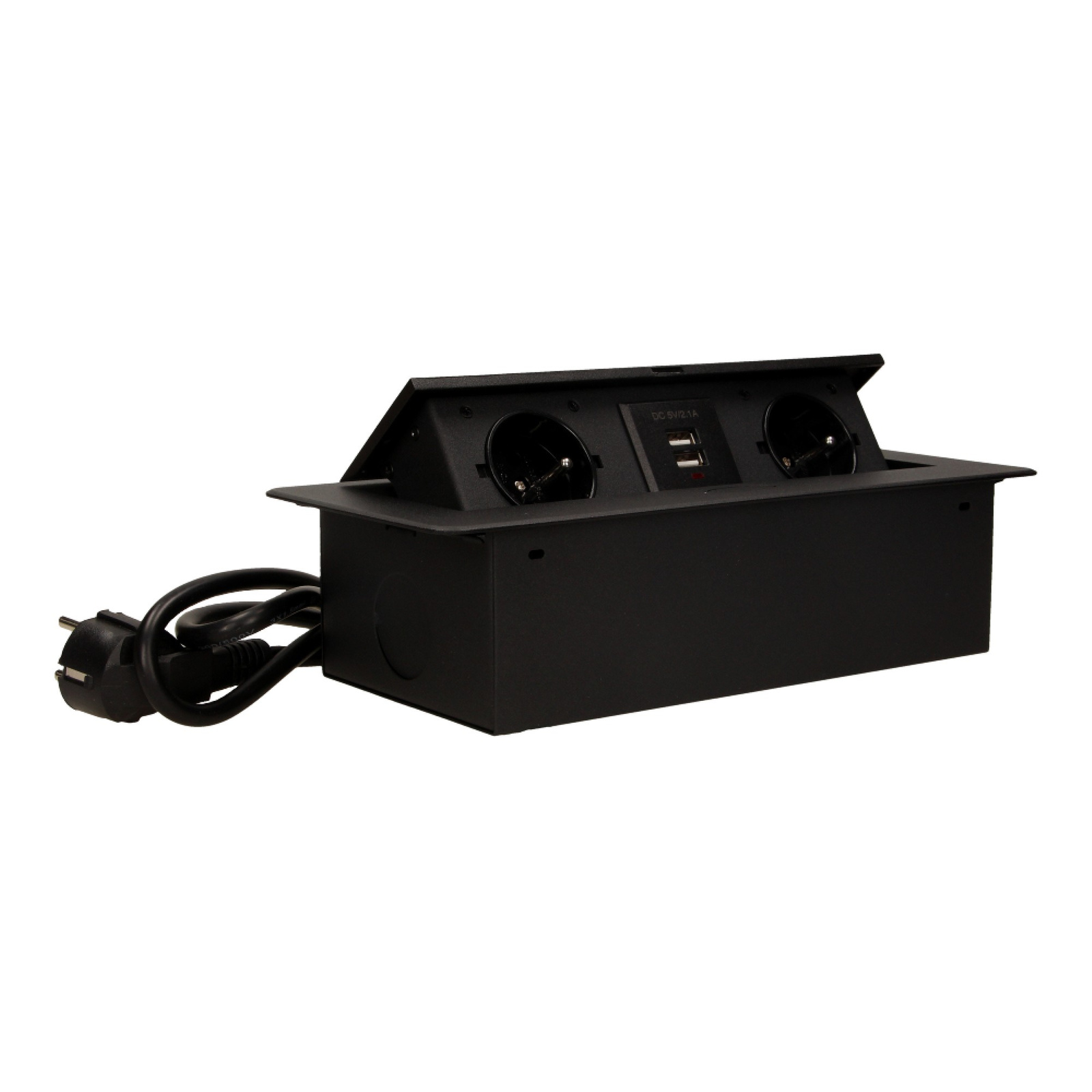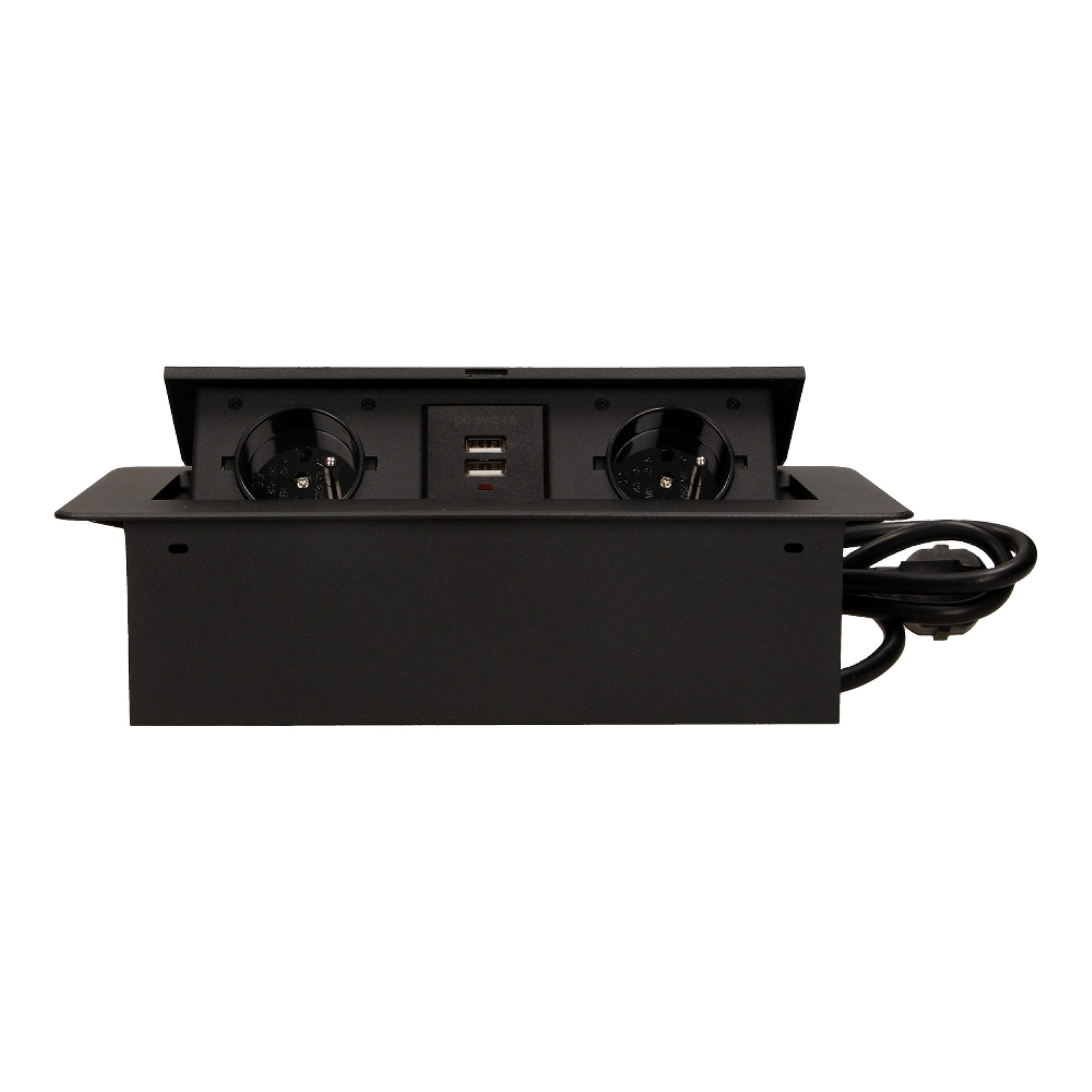 Gniazdo meblowe wpuszczane w blat z płaskim frezowanym rantem, ładowarką USB i przewodem 1,5m, 2x2P+Z, 2xUSB, czarne