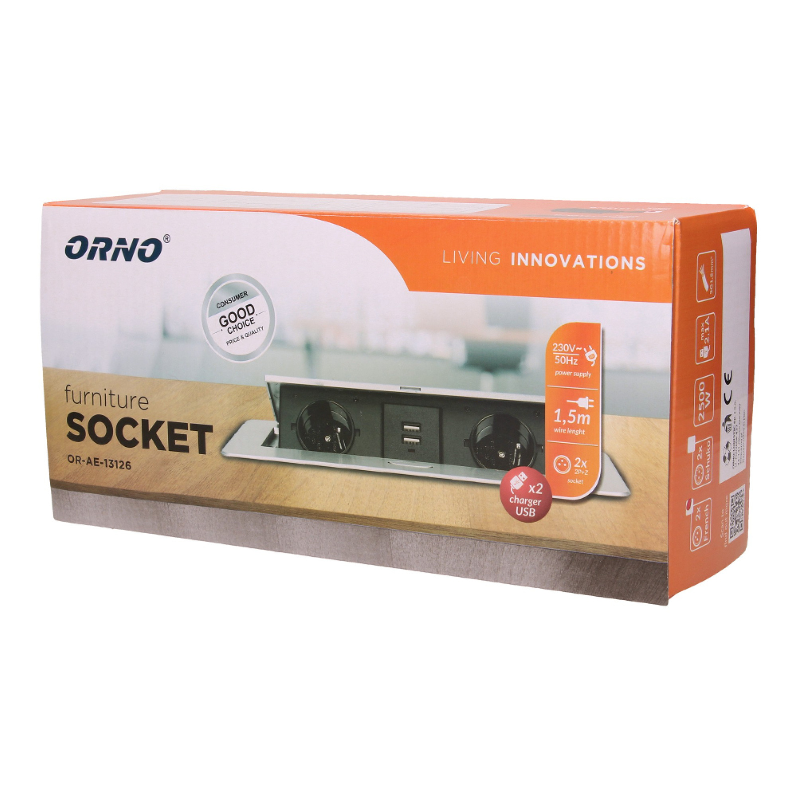 Zestaw dwóch gniazd sieciowych z uziemieniem i przesłonami torów prądowych, połączonych z ładowarką USB w obudowie chowanej w blat. Urządzenie przeznaczone jest do montażu w biurkach, blatach i stołach, może być zamontowane zarówno w pozycji pionowej jak i poziomej zapewniając dostęp do gniazd elektrycznych. Dostępne kolory: czarny, srebrny.