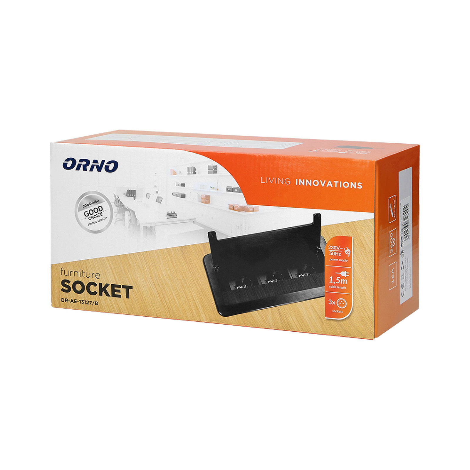 Zestaw trzech gniazd sieciowych z uziemieniem schuko w obudowie chowanej w blat. Urządzenie przeznaczone jest do montażu pionowego lub poziomego w biurkach, blatach i stołach. Posiada zamykany panel z gniazdami sieciowymi, szczelinę wykończoną szczotką przeciwkurzową oraz przewód o długości 1,5 m.