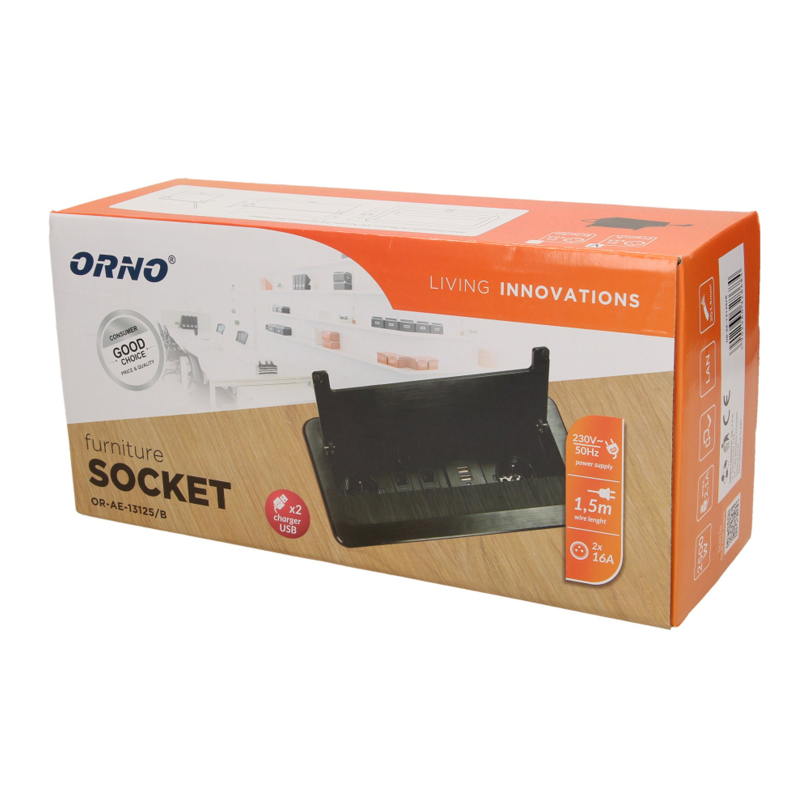Gniazdo meblowe wpuszczane w blat z płaskim frezowanym rantem. szczotką przeciwkurzową. ładowarką USB i przewodem 1.5m.... OR-AE-13125/B
