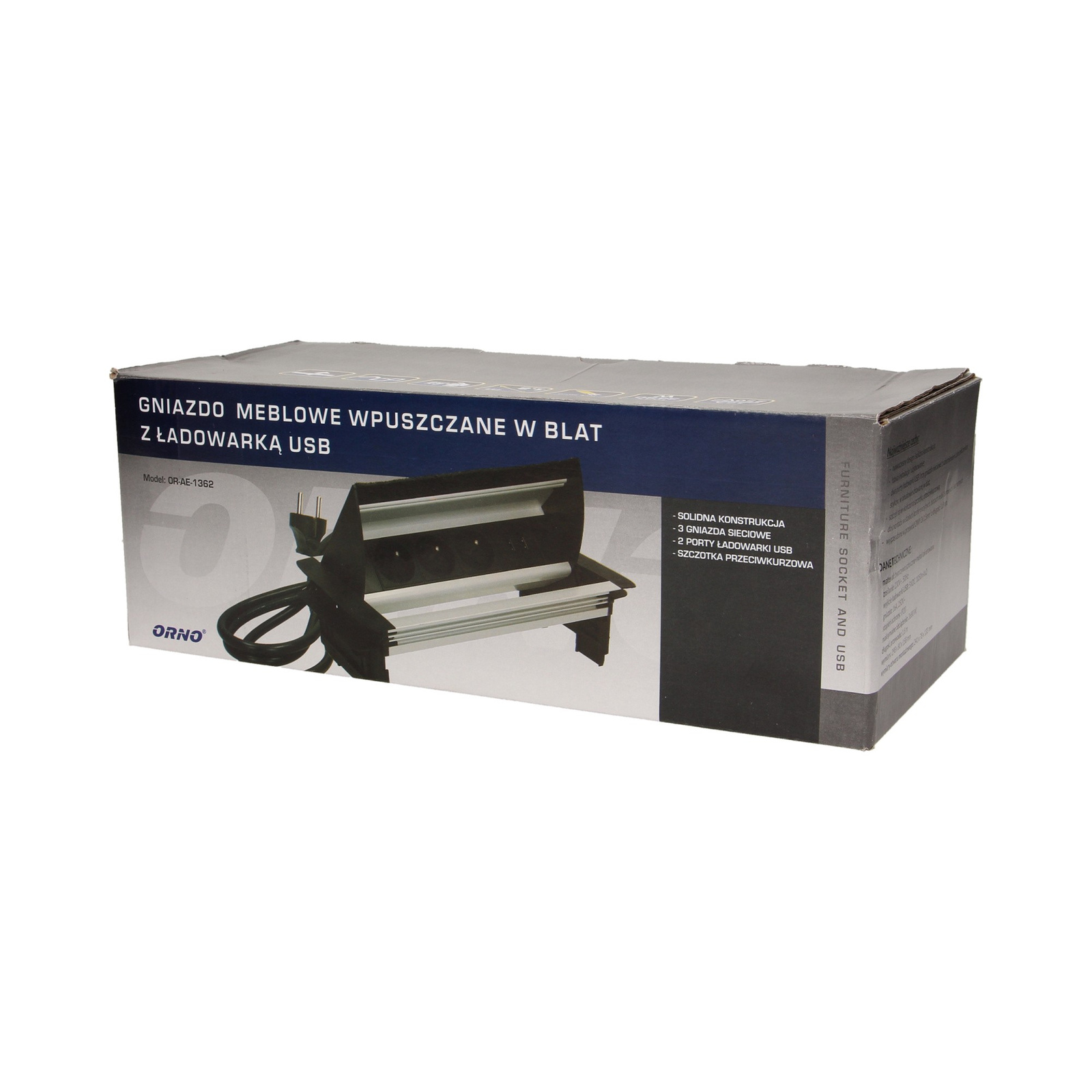 Gniazdo meblowe wpuszczane w blat ze szczotką przeciwkurzową. ładowarką USB i przewodem 1.8m. 3x2P+Z. 2xUSB OR-AE-1362