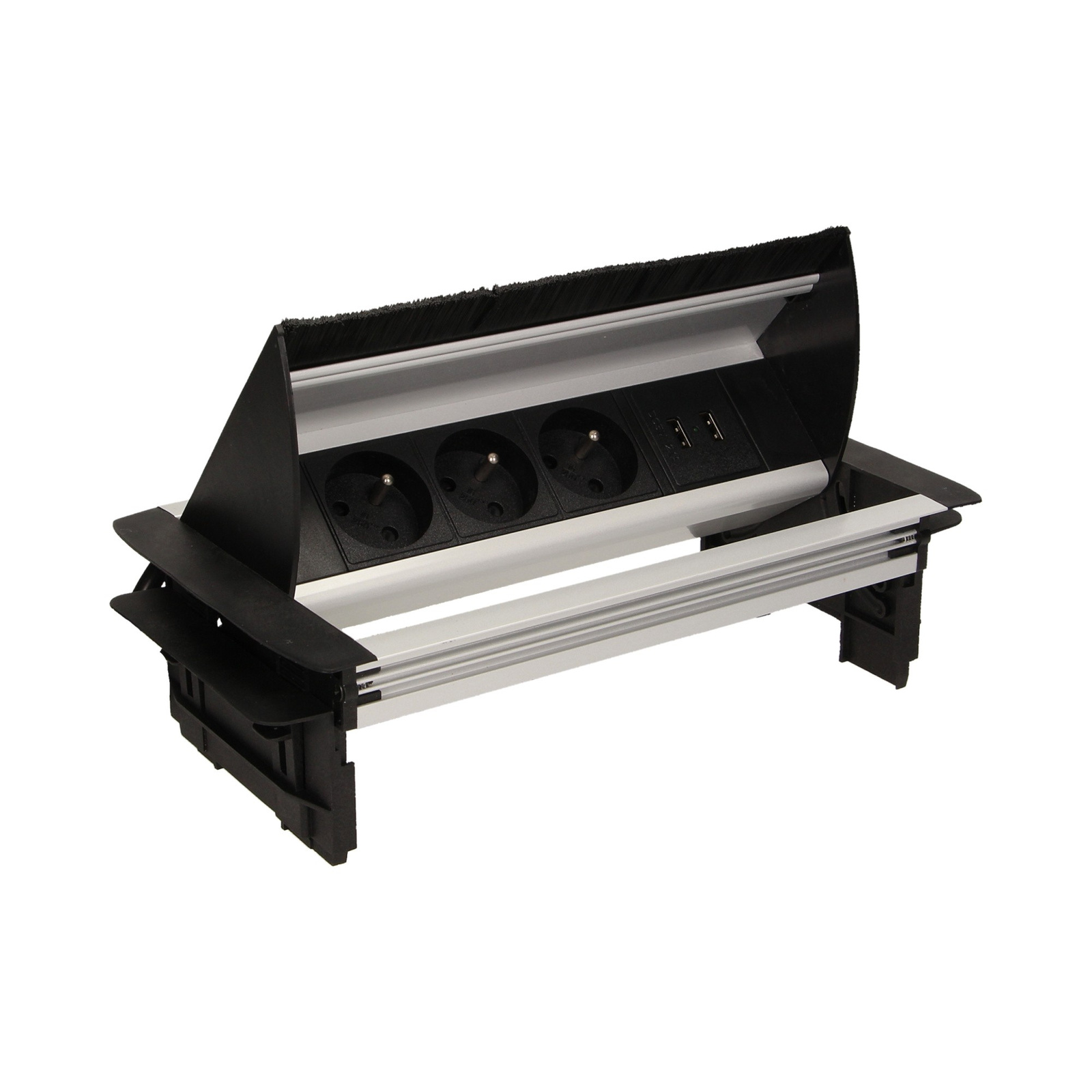 Zestaw trzech gniazd sieciowych z uziemieniem i przesłonami torów prądowych, połączonych z ładowarką USB w obudowie chowanej w blat. Urządzenie przeznaczone do montażu w biurkach, blatach i stołach. Posiada zamykany panel z gniazdami sieciowymi, szczelinę wykończoną szczotką przeciwkurzową oraz przewód o długości 1,8m.