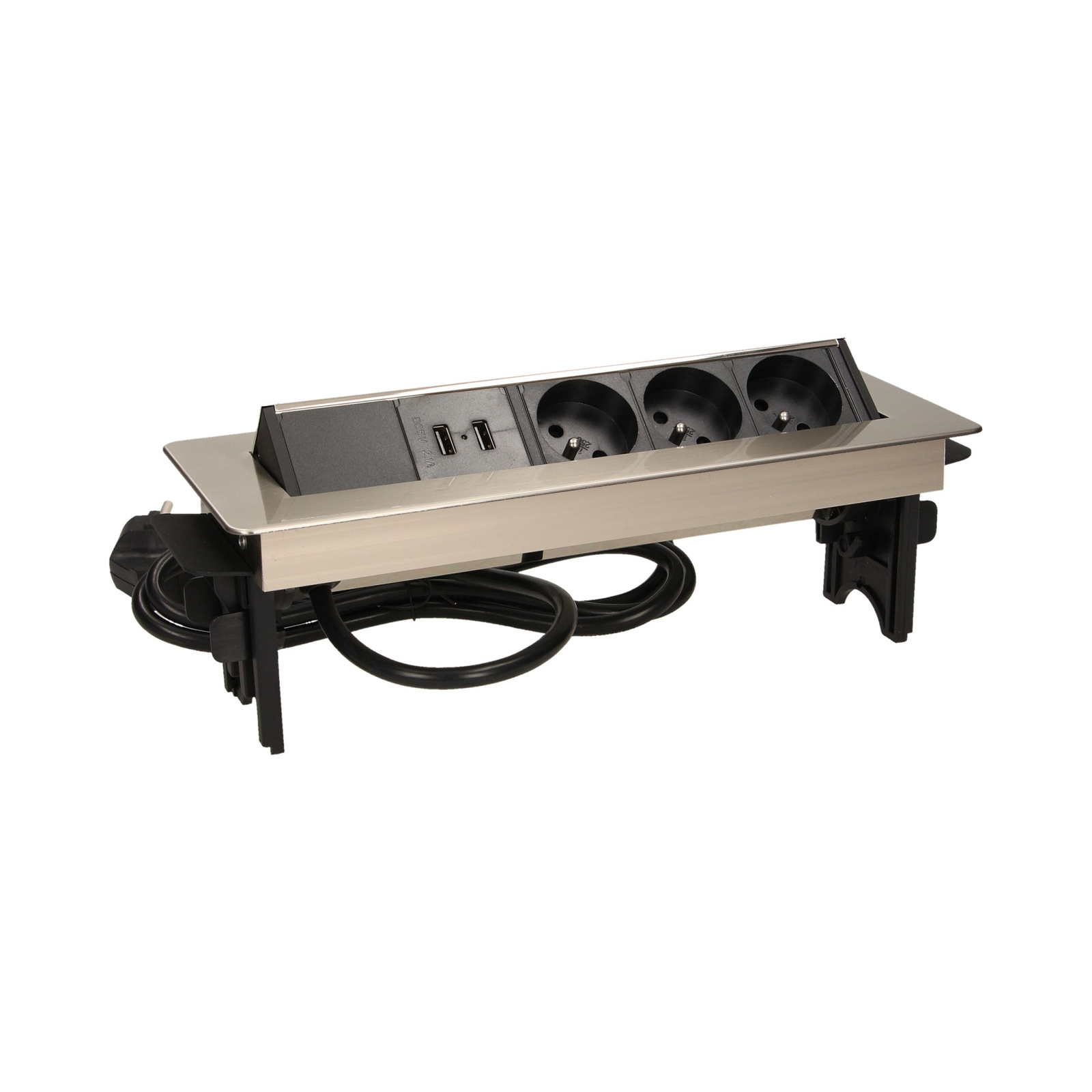Zestaw trzech gniazd sieciowych z uziemieniem i przesłonami torów prądowych, połączonych z ładowarką USB w niklowanej obudowie chowanej w blacie biurka lub stołu. Połączenie nowoczesnej konstrukcji z wysoką jakością wykonania sprawia, że produkt idealnie nadaje się do zastosowania w biurze, sali konferencyjnej, gabinecie, warsztacie, a także w domu. Posiada zamykany panel z gniazdami oraz przewód o długości 1,8 m.