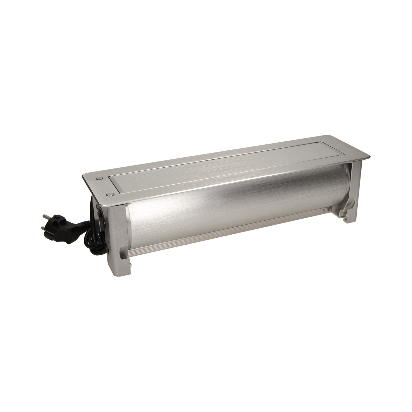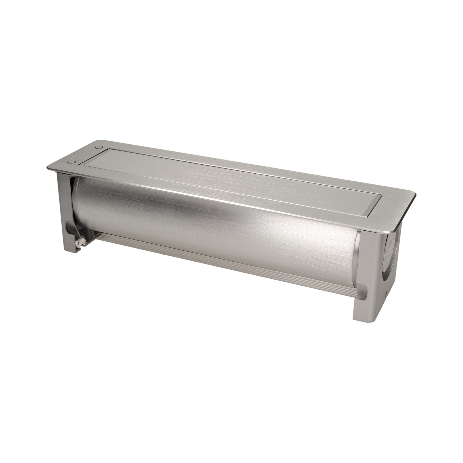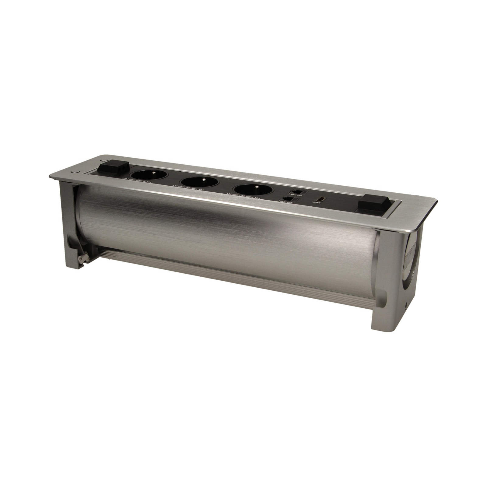 Zestaw trzech gniazd sieciowych z uziemieniem i przesłonami torów prądowych, dwóch gniazd network oraz gniazda HDMI w obudowie chowanej w w blacie biurka lub stołu. Urządzenie wyposażone w innowacyjny mechanizm elektrycznego otwierania i zamykania (obrót o 180°) oraz fotoelektryczne zabezpieczenie przed zamknięciem. Idealnie nadaje się do zastosowania w biurze, sali konferencyjnej, gabinecie, a także w domu, może być zamontowane zarówno w pozycji pionowej jak i poziomej.