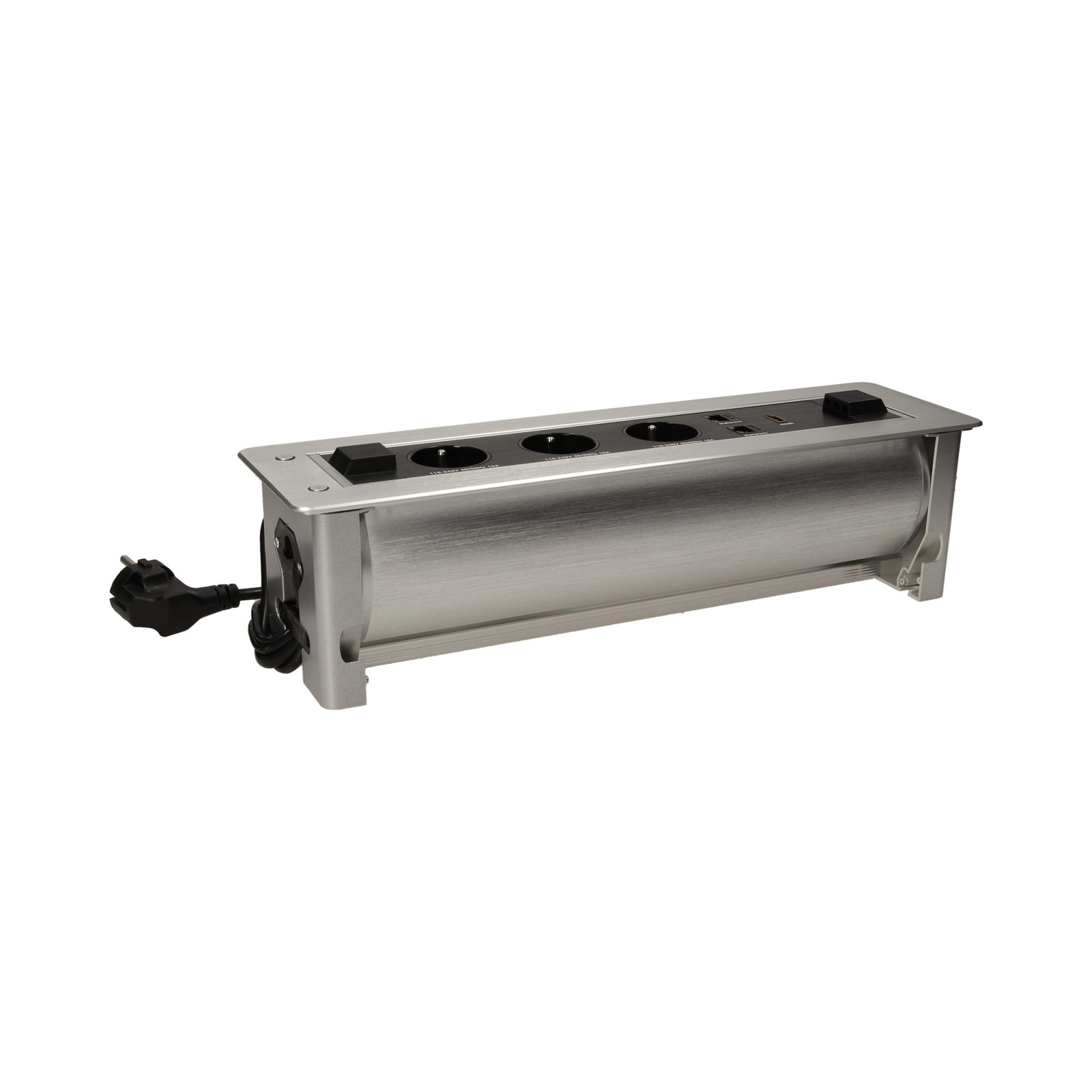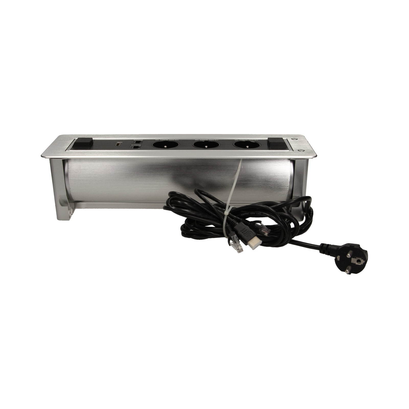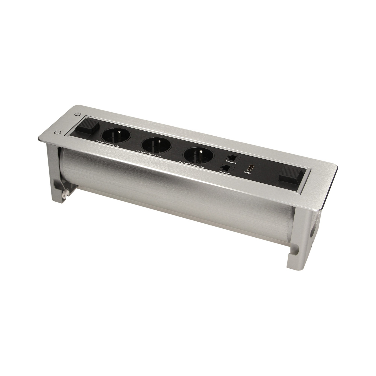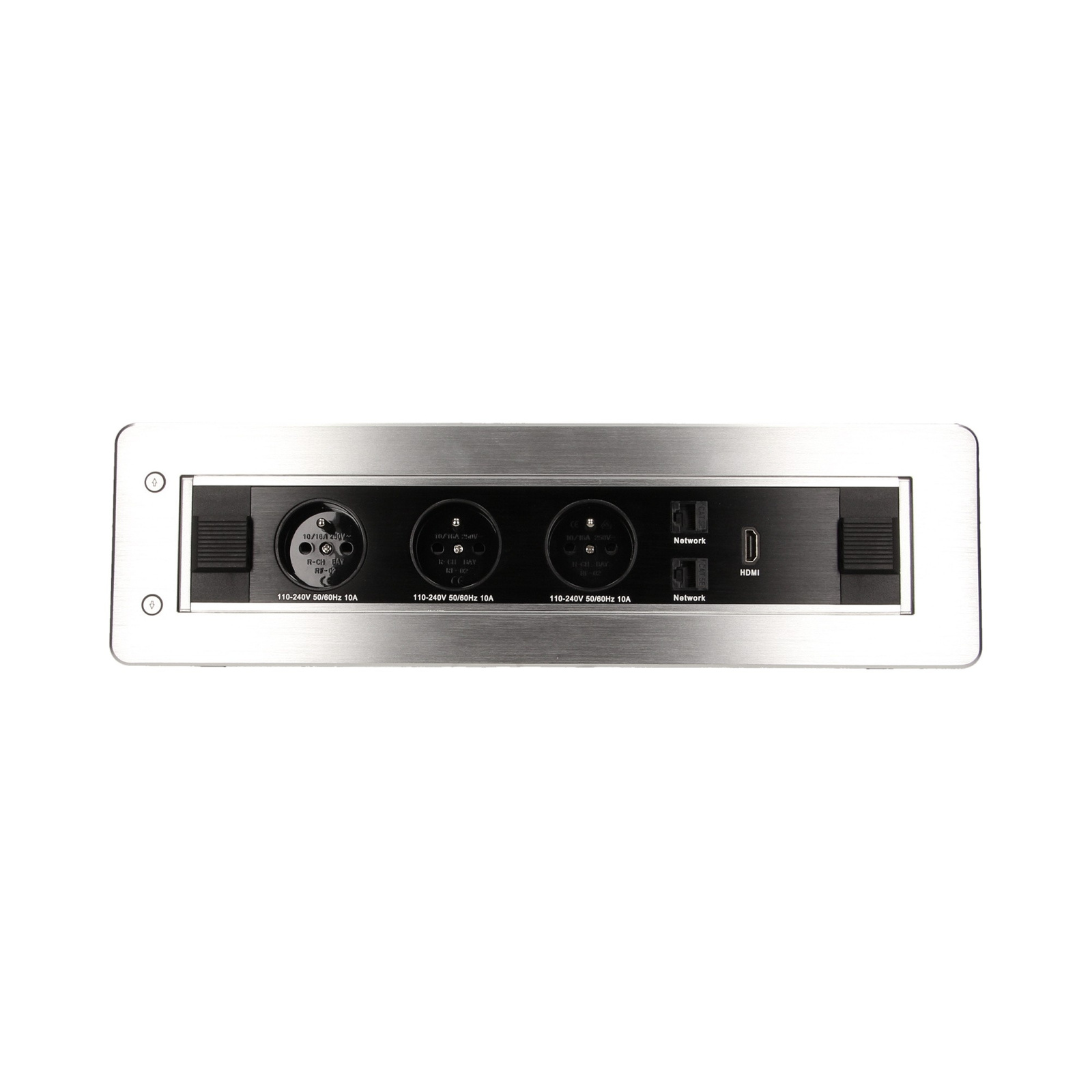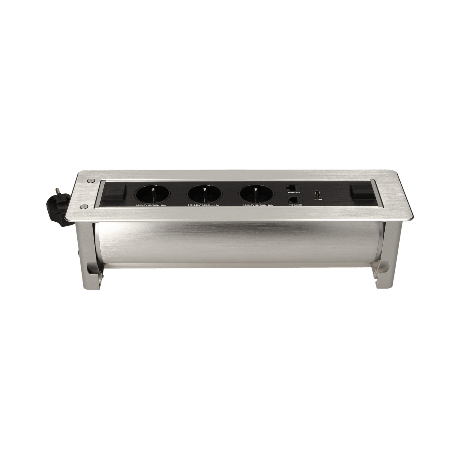 Gniazdo meblowe wpuszczane w blat z płaskim frezowanym rantem oraz elektrycznym otwieraniem, 3x2P+Z,2xNET,1xHDMI
