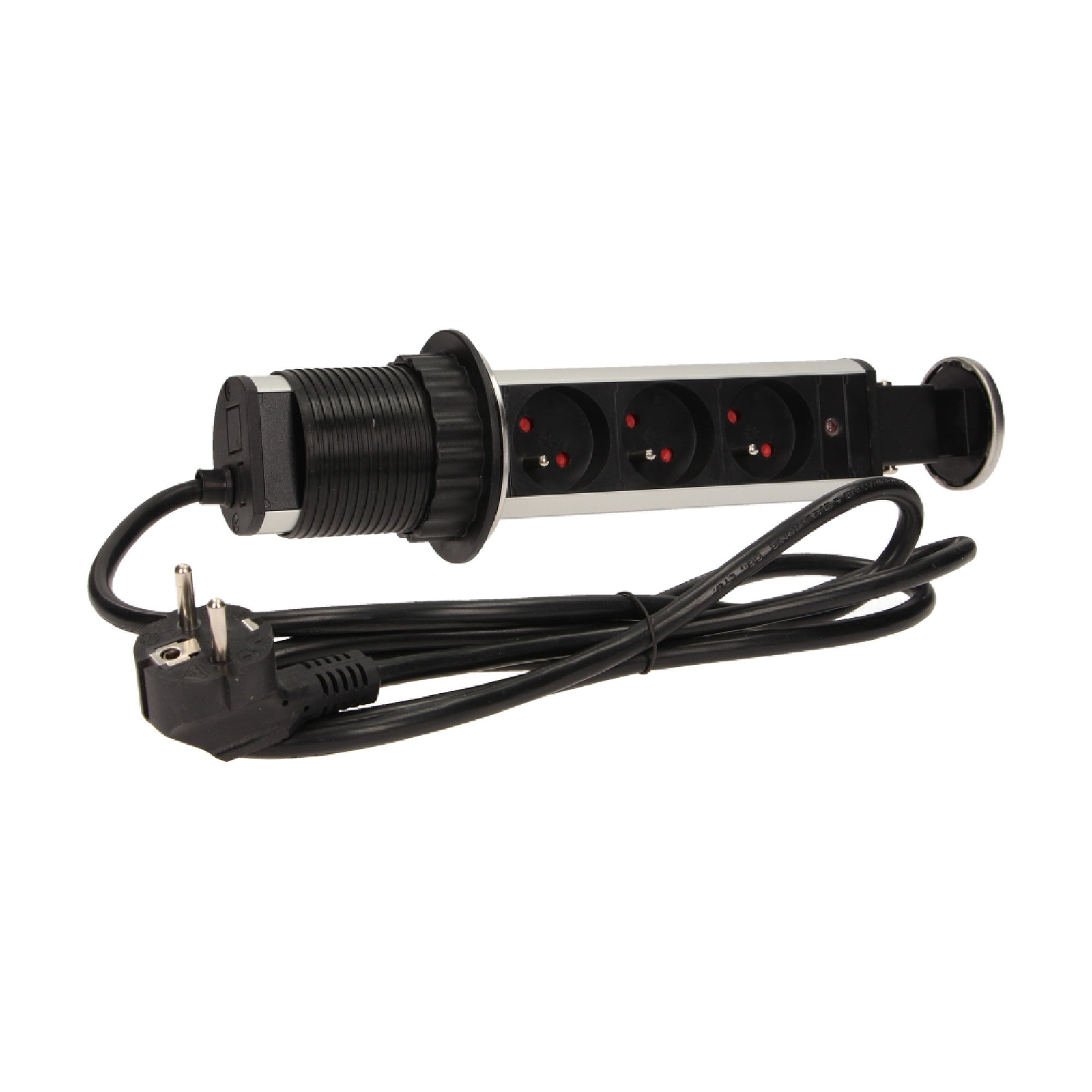 Zestaw trzech gniazd sieciowych z uziemieniem i przesłonami torów prądowych w obudowie chowanej w blat. Urządzenie przeznaczone do montażu w stołach konferencyjnych, blatach mebli biurowych i kuchennych. Posiada wysuwany panel z gniazdami, dodatkową blokadę oraz przewód o długości 1,8 m. Stal nierdzewna INOX.