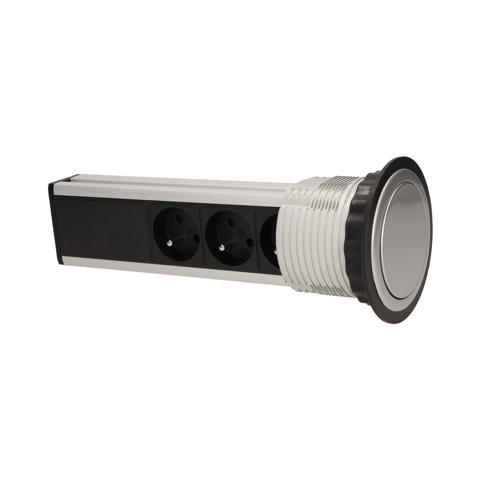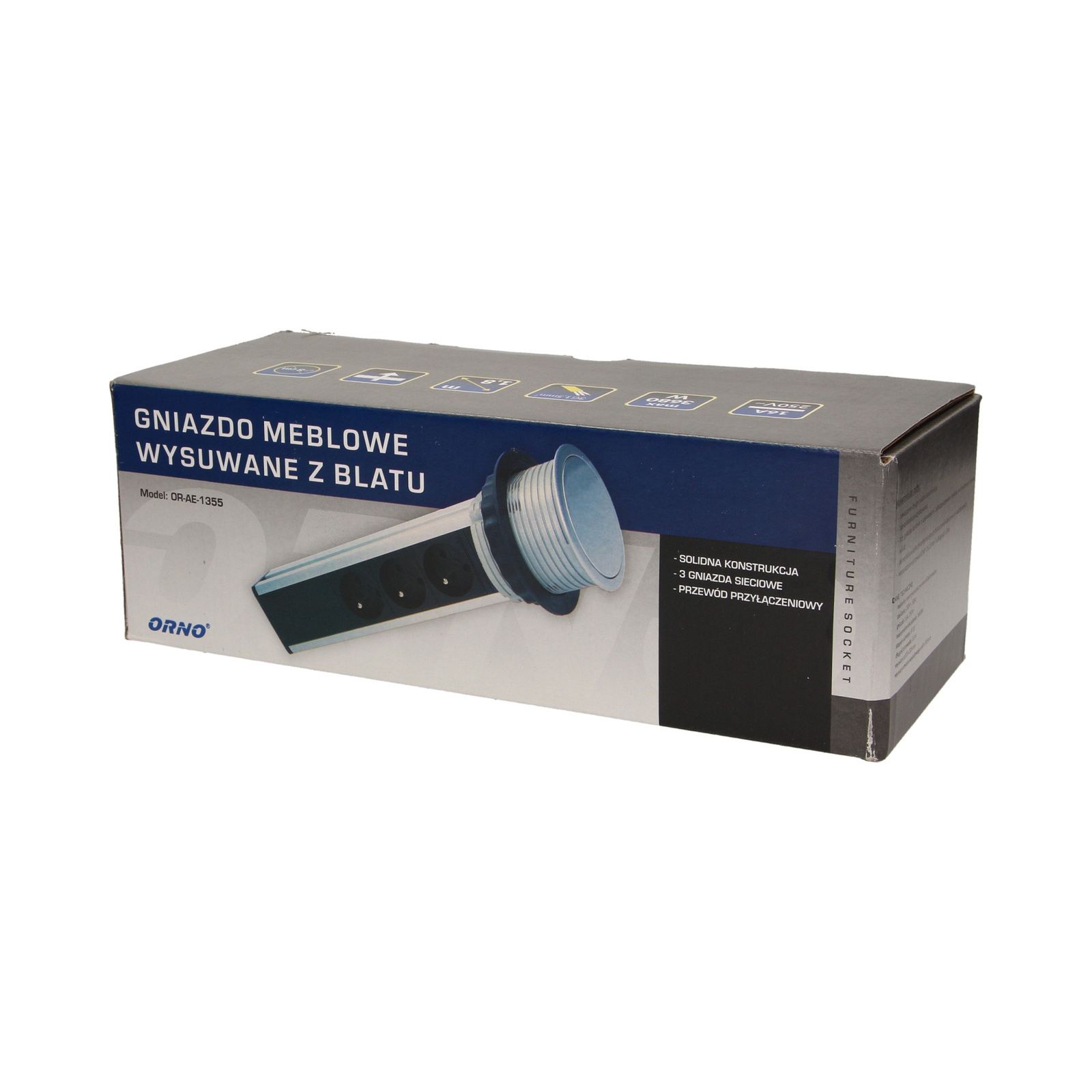 Zestaw trzech gniazd sieciowych z uziemieniem i przesłonami torów prądowych w obudowie chowanej w blat. Urządzenie przeznaczone do montażu w stołach konferencyjnych, blatach mebli biurowych i kuchennych. Posiada wysuwany panel z gniazdami oraz przewód o długości 1,8 m. Tworzywo sztuczne + metal lakierowany srebrny.