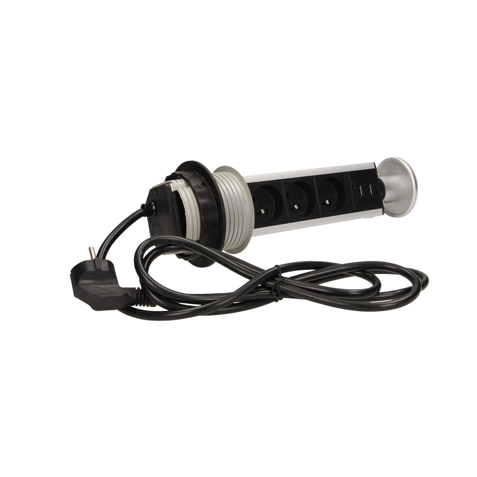 Zestaw trzech gniazd sieciowych z uziemieniem i przesłonami torów prądowych, połączonych z ładowarką USB w obudowie chowanej w blat. Urządzenie przeznaczone do montażu w stołach konferencyjnych, blatach mebli biurowych i kuchennych. Posiada wysuwany panel z gniazdami oraz przewód o długości 1,8 m. Tworzywo sztuczne + metal lakierowany srebrny.