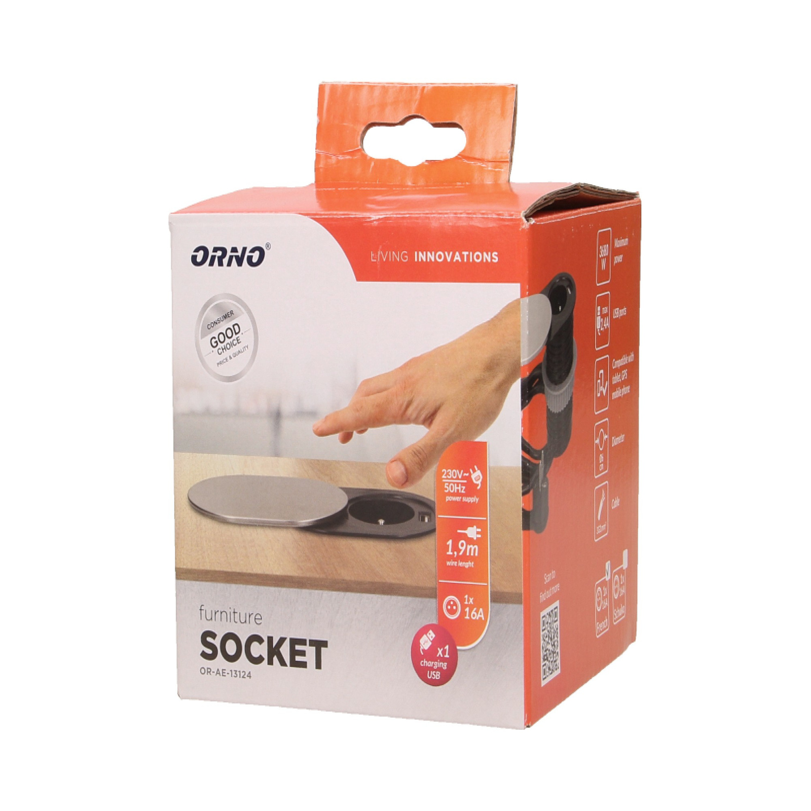 Gniazdo meblowe Ø6cm. wpuszczane w blat z przesuwną pokrywką. ładowarką USB i przewodem 1.9m. 1x2P+Z. 1xUSB (2.4A). 3x1mm2 OR-AE-13124