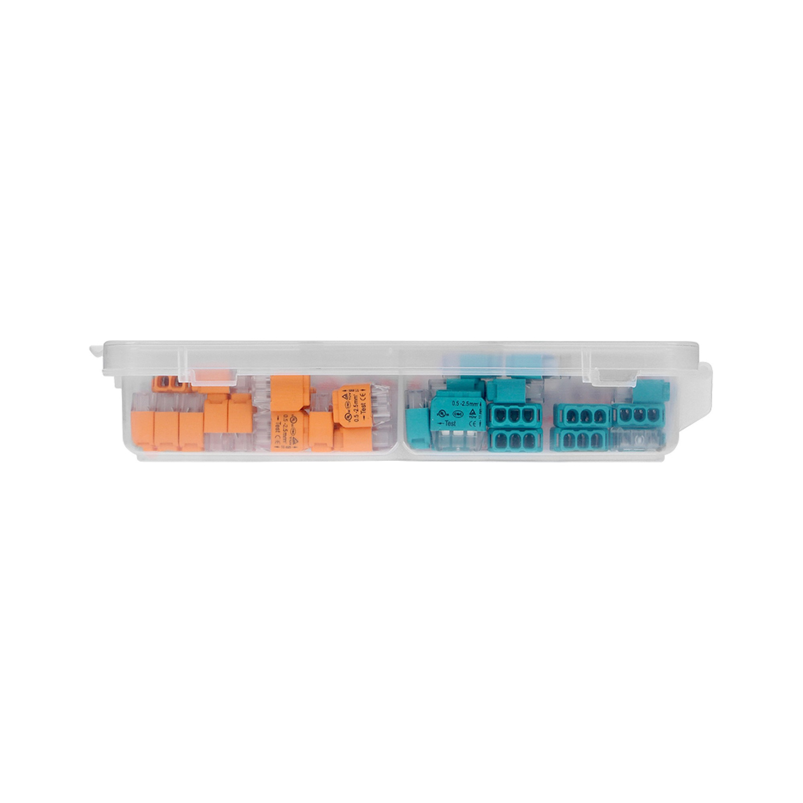 Zestaw złączek instalacyjnych APARTMENT, 65 sztuk. Wciskane: 15x 2-przew. 15x 3-przew. 10x 4-przew. Zaciskowe: 10x 2-przew. 15x 3-przew.