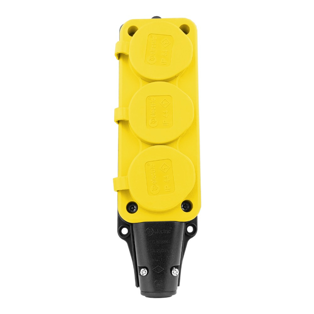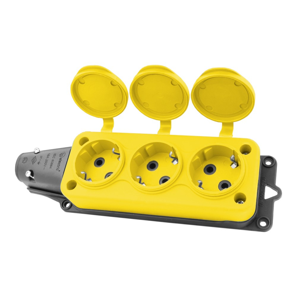 - Listwa zasilająca z trzema gniazdami 16A 230V bez przewodu w systemie Schuko w kolorze żółtym