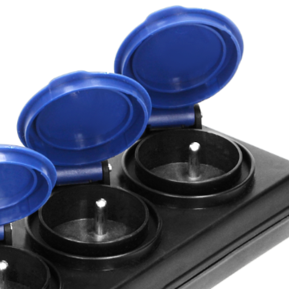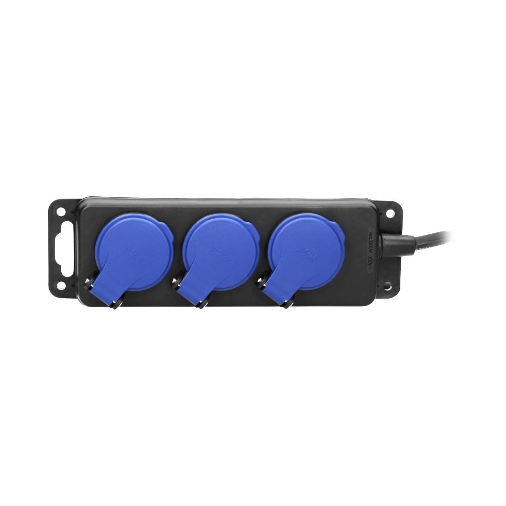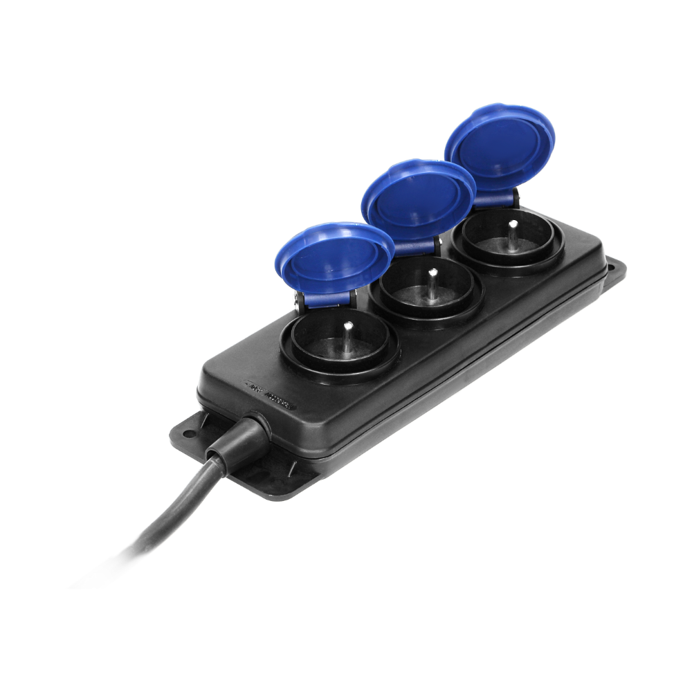➡️ Posiada 3 gniazda sieciowe z uziemieniem i przesłonami torów prądowych oraz pokrywami uszczelniającymi, które chronią przed zabrudzeniami i wilgocią.