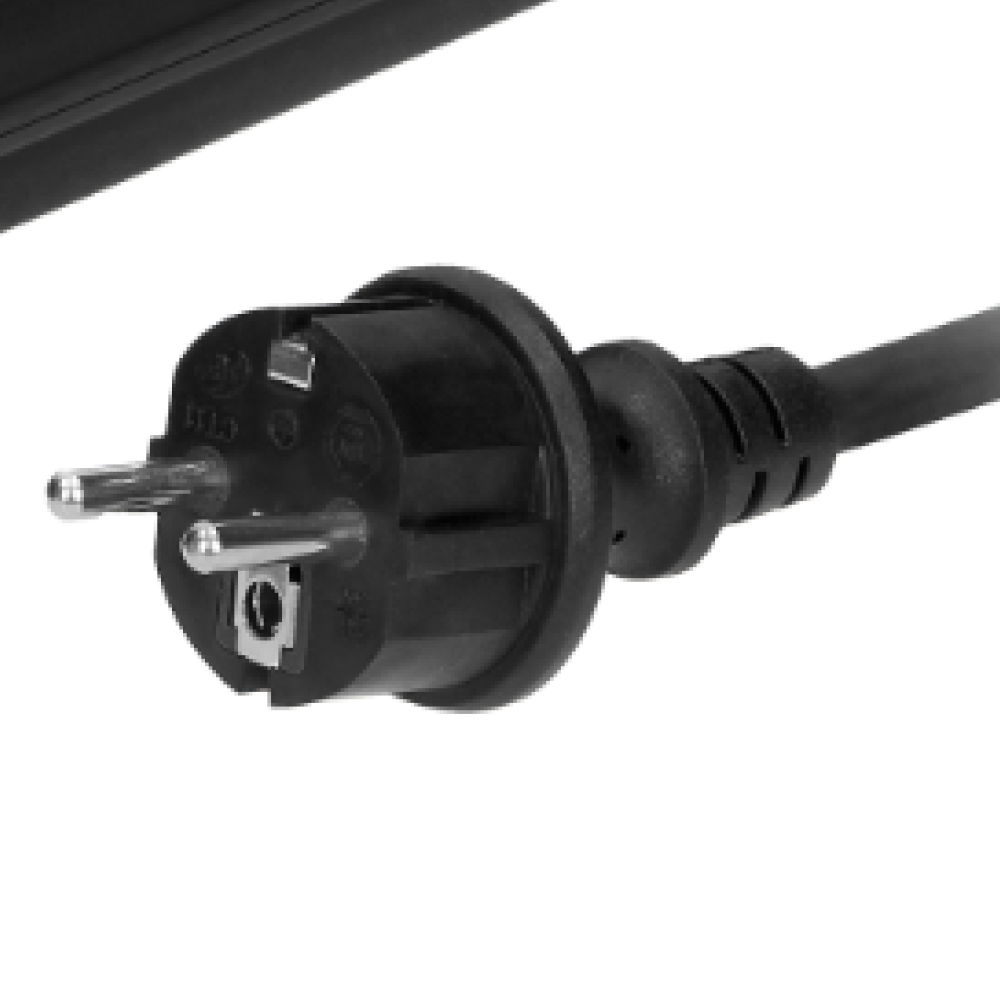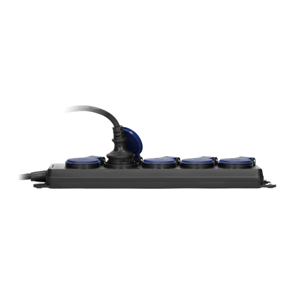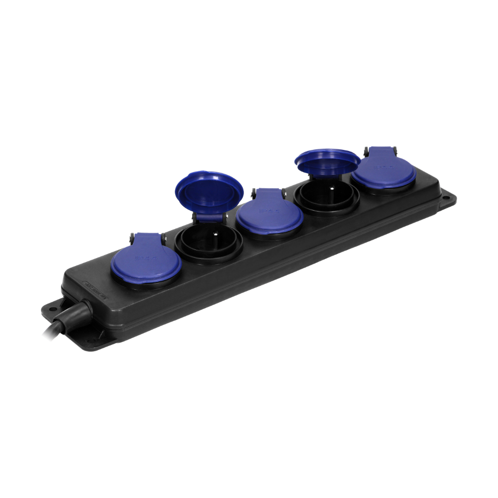 ➡️ Posiada 5 gniazd sieciowych z uziemieniem i przesłonami torów prądowych oraz pokrywami uszczelniającymi, które chronią przed zabrudzeniami i wilgocią.
