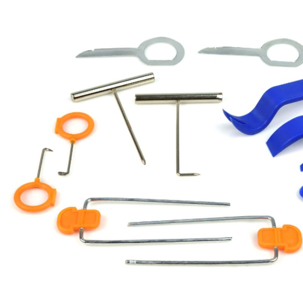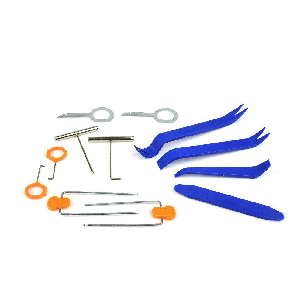 ➡️ Zestaw narzędzi do demontażu radia i tapicerki. Doskonale sprawdzi się w każdym warsztacie samochodowym, a w szczególności w warsztatach zajmujących się elektroniką samochodową. W komplecie znajduję się zestaw łyżek i dźwigni przeznaczonych do demontażu tapicerki oraz zestaw do demontażu radia i nawigacji.