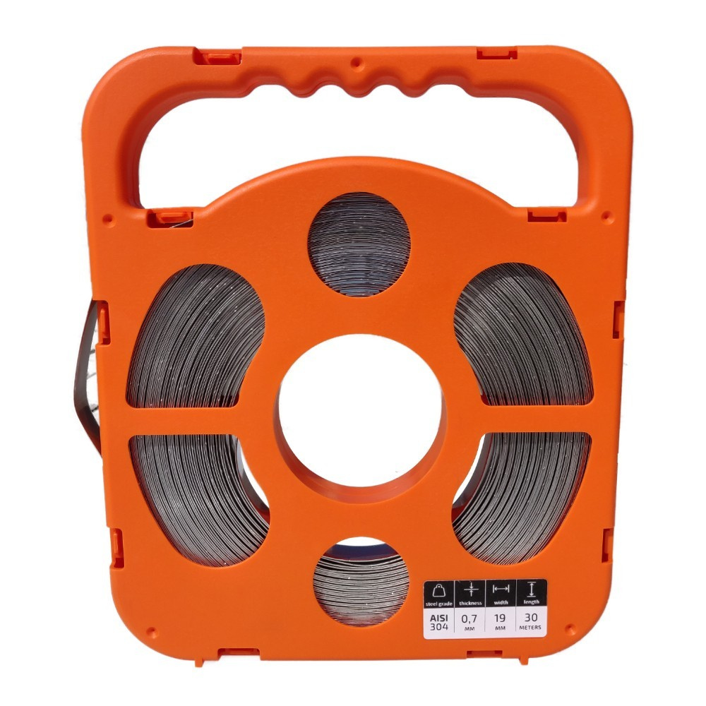 Taśma stalowa 0,7 x 19mm 30m zimnowalcowana nierdzewna gatunek 304 z uchwytem